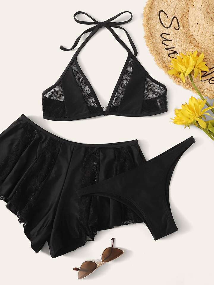 3pcs Contrast Lace Halter Co-ord Bikini Set