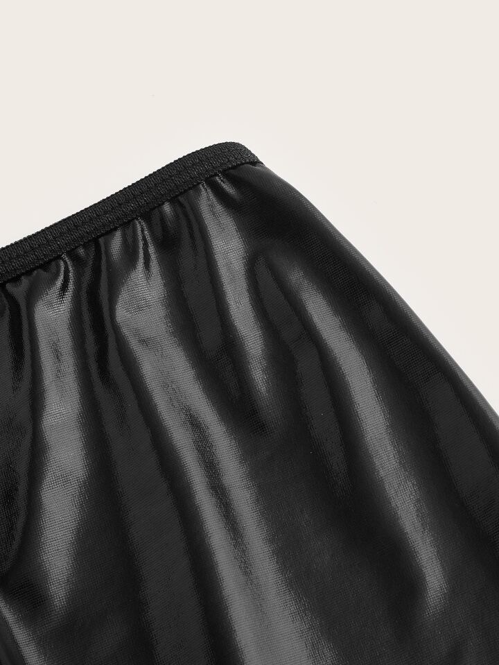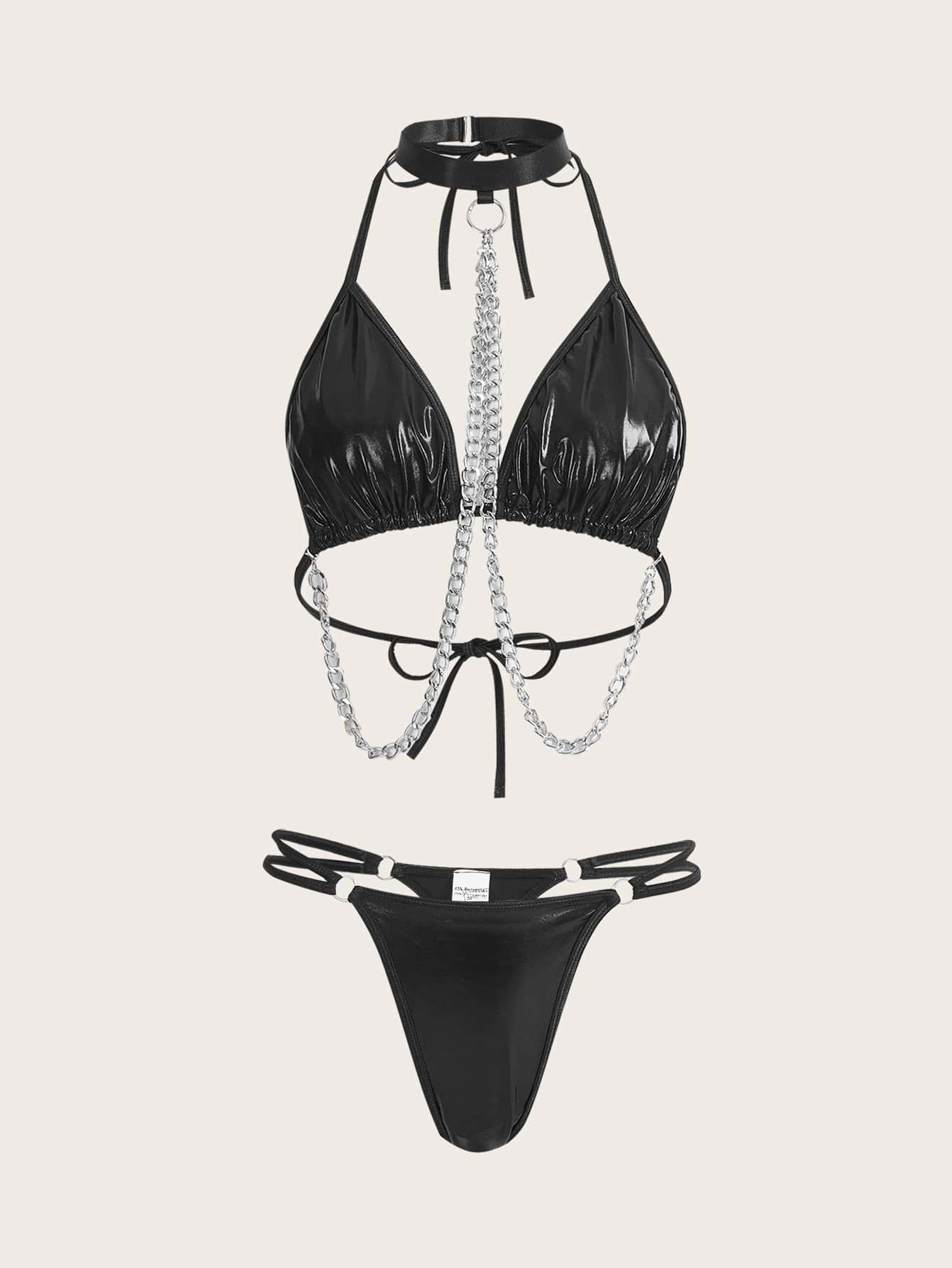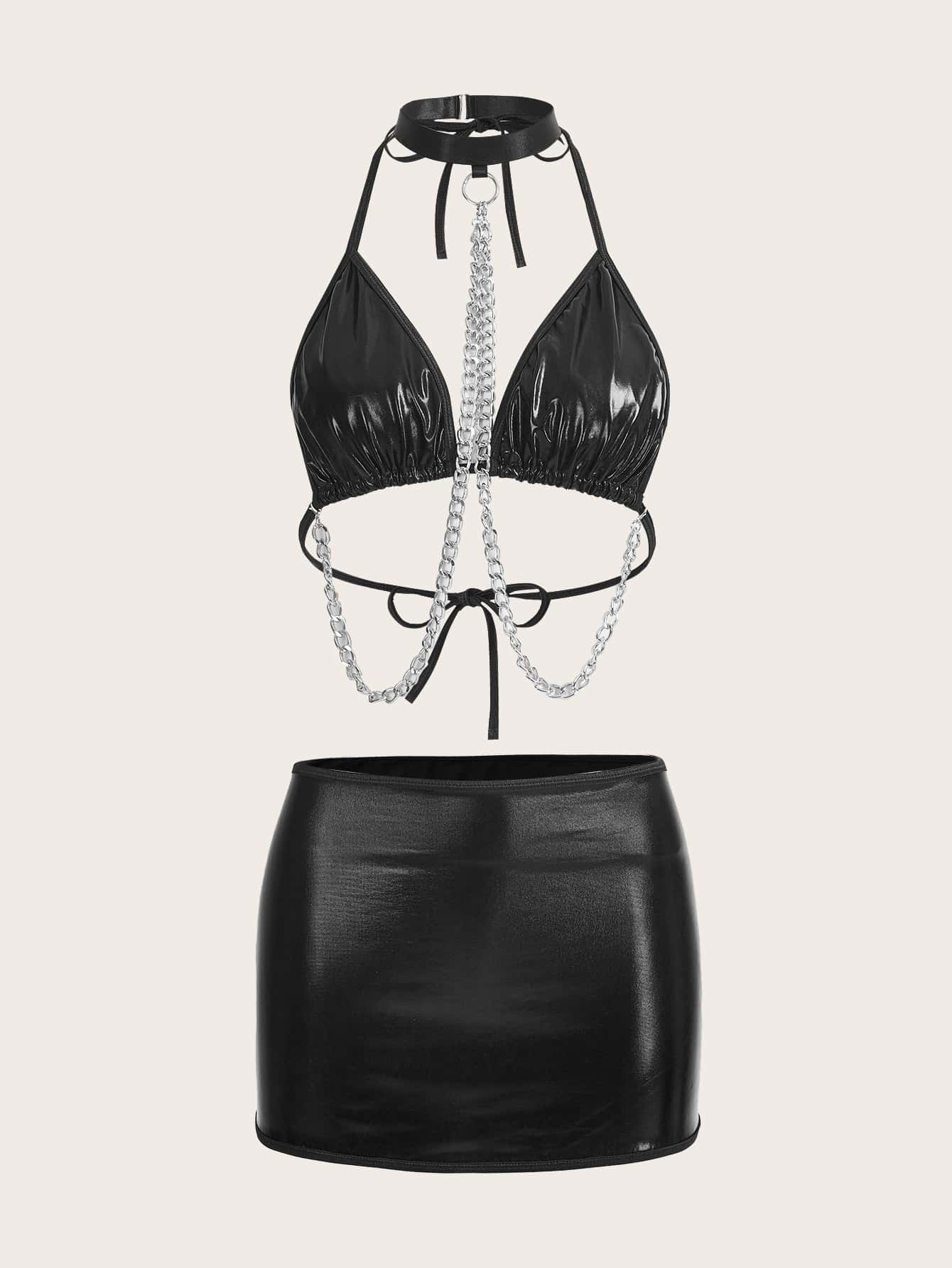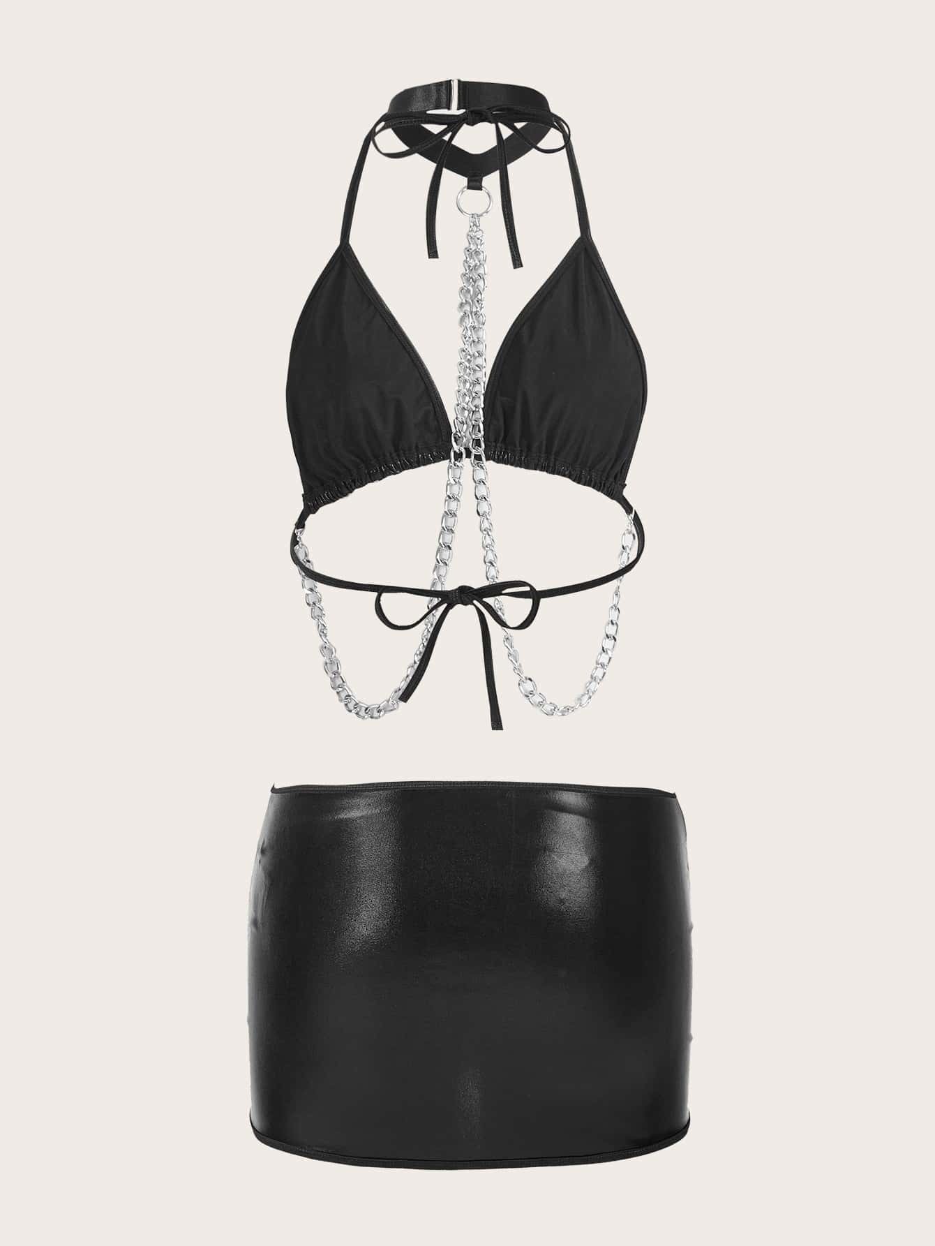 3pcs Gothic Punk Faux Leather Chain Halter Bralette, Thong Panty And Mini Skirt Sexy Lingerie Set