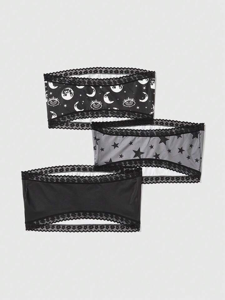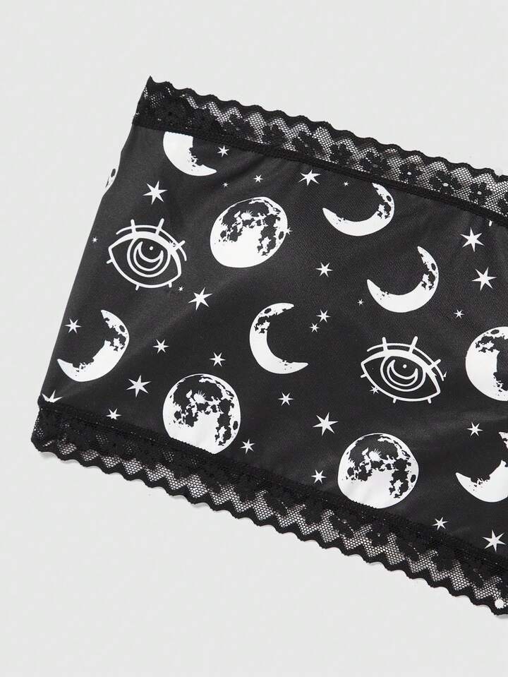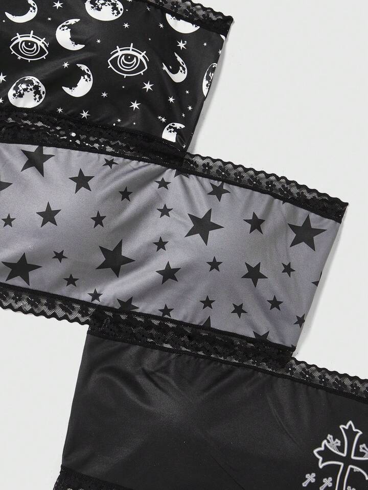 3pcs/Set Women's Gothic Dark Style Starry Eyes Cross Wrap Top With Lace & Mesh Splice, Including Skirt And T-Back