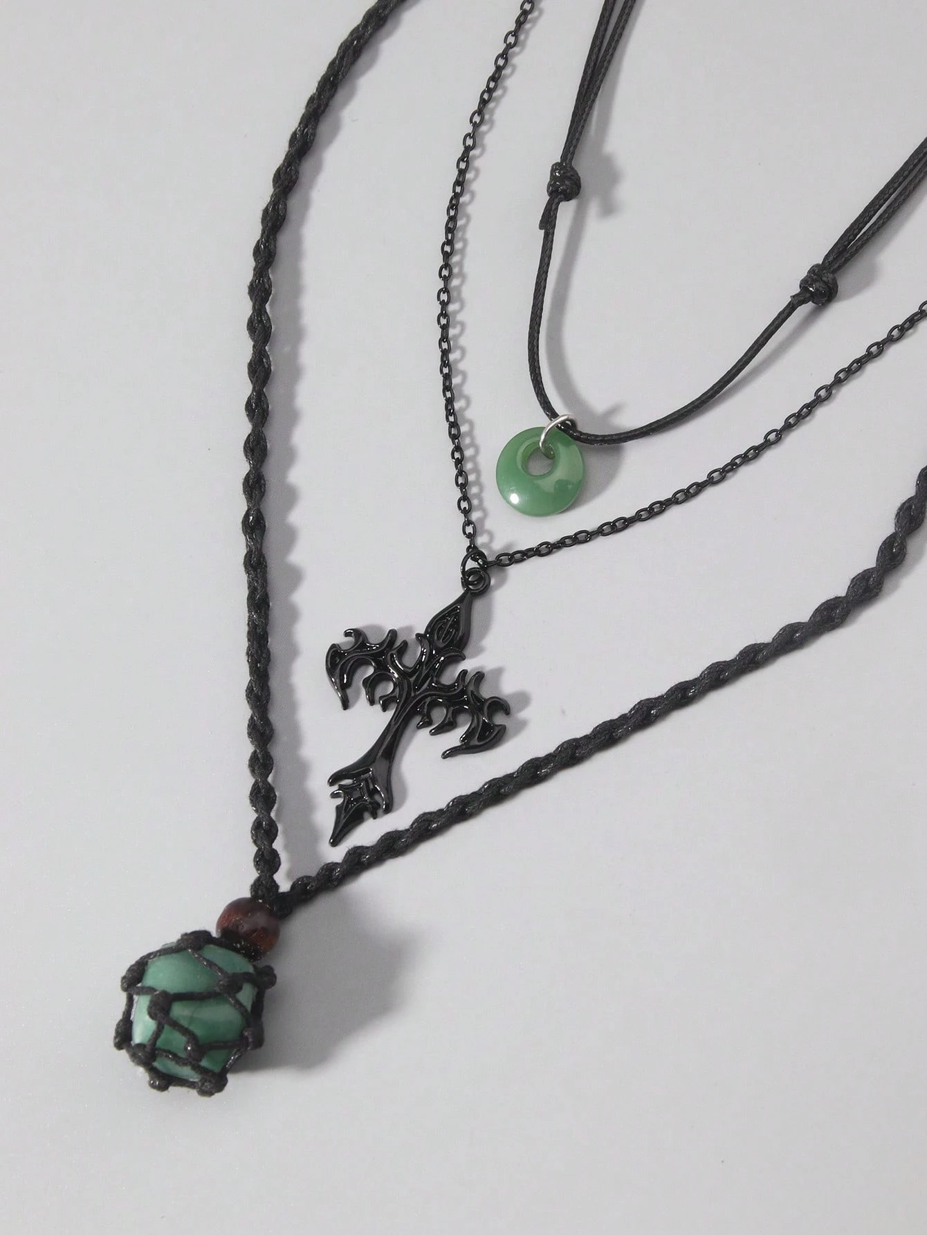 Fairycore 3pcs Vintage Punk Black Flame Cross Pendant Necklace, Handmade Woven Natural Stone Multi-Layer Necklace For Women