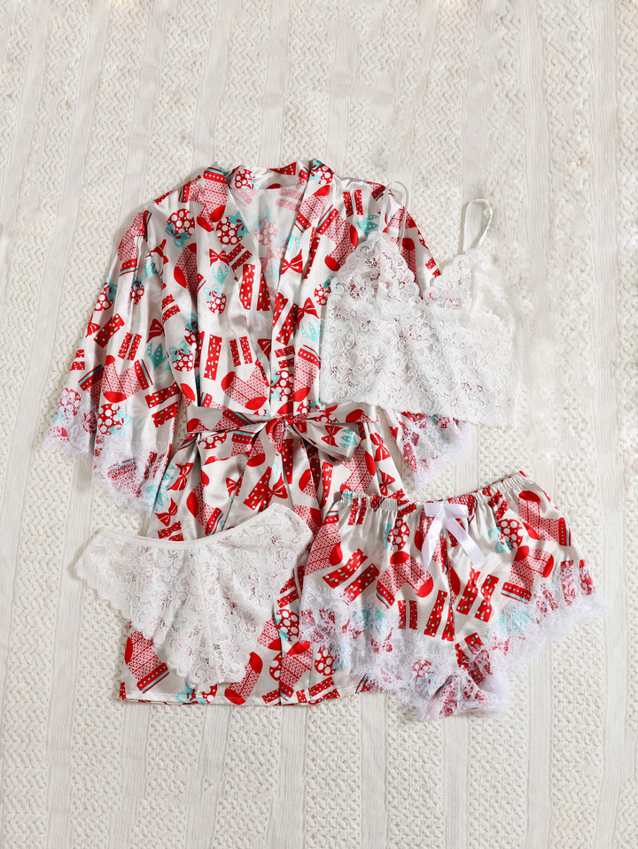 4pack Christmas Print Satin Lingerie Set With Shorts & Belted Robe