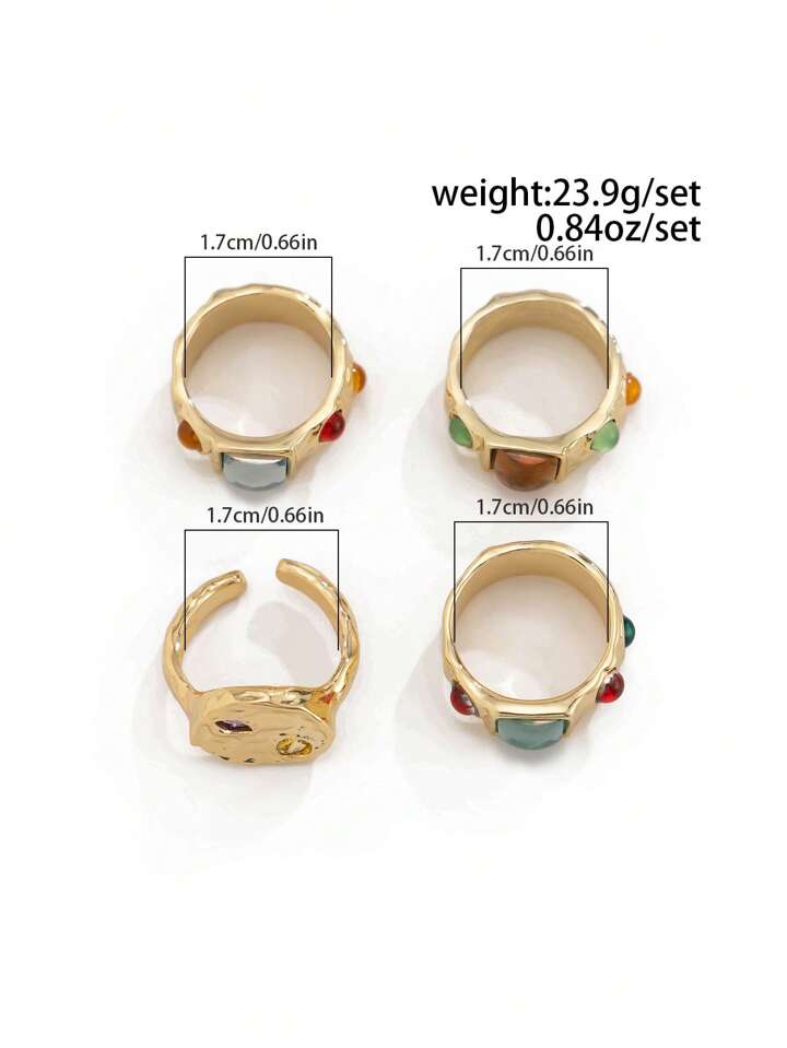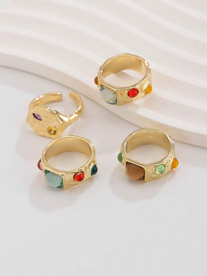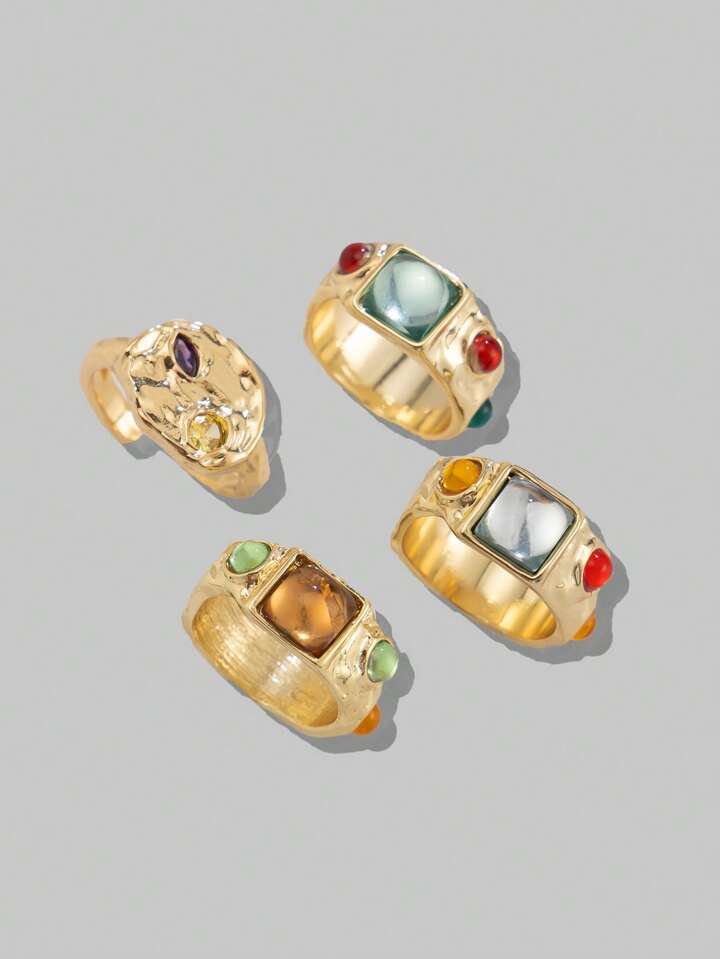 Fairycore 4pcs Vintage Luxurious Multicolor Crystal Rhinestone Ring Set