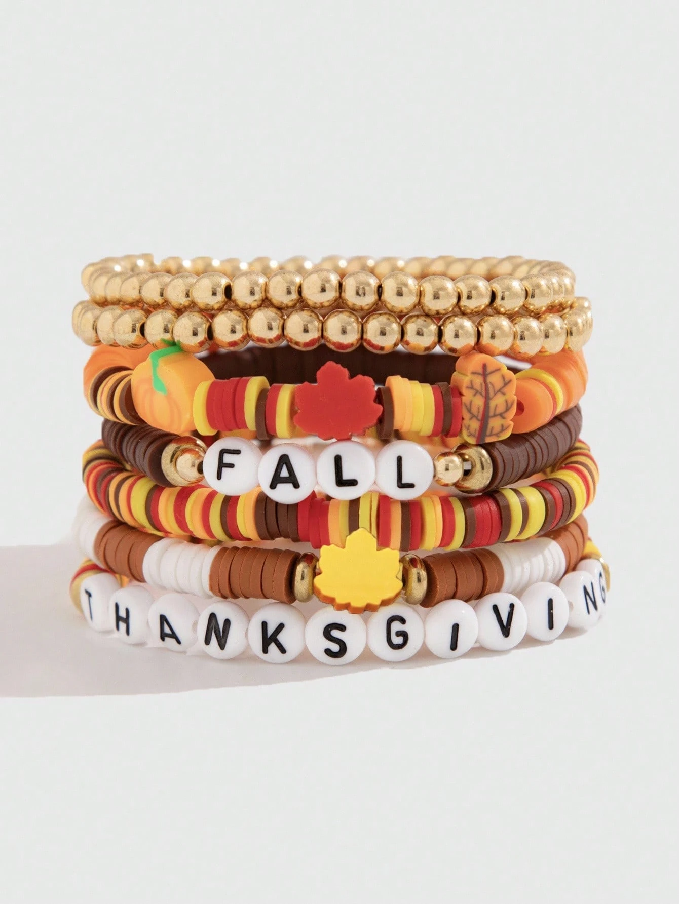 Fairycore 7pcs/Set Thanksgiving Letter Beaded Crystal Polymer Clay Charm Bracelets, Handmade Maple Leaf & Pumpkin Charm Bracelets, Autumn Thanksgiving Jewelry Gift For Wife/Daughter, Halloween