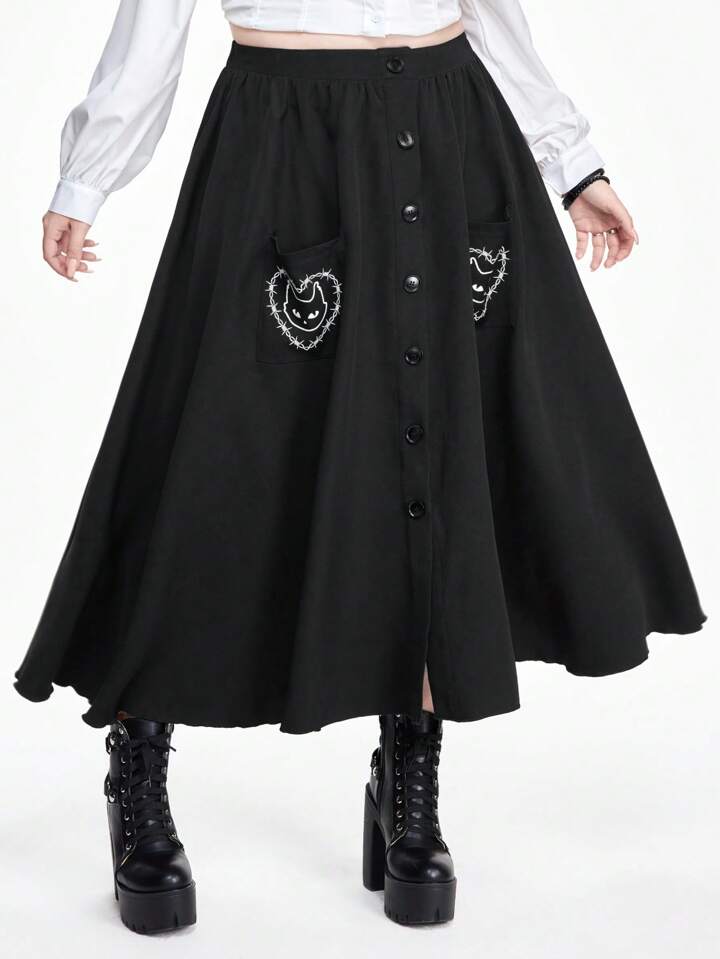 Academia Collegiate Style Pocket & Dark Thorn Cat Print Button-Up A-Line Plus Size Skirt