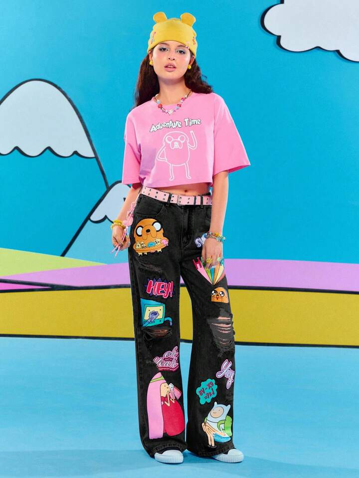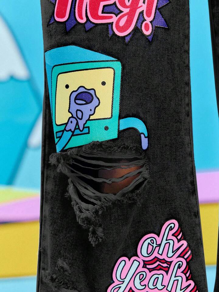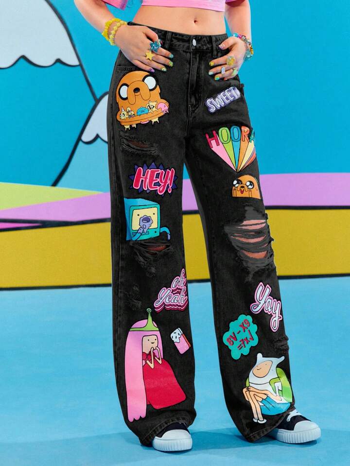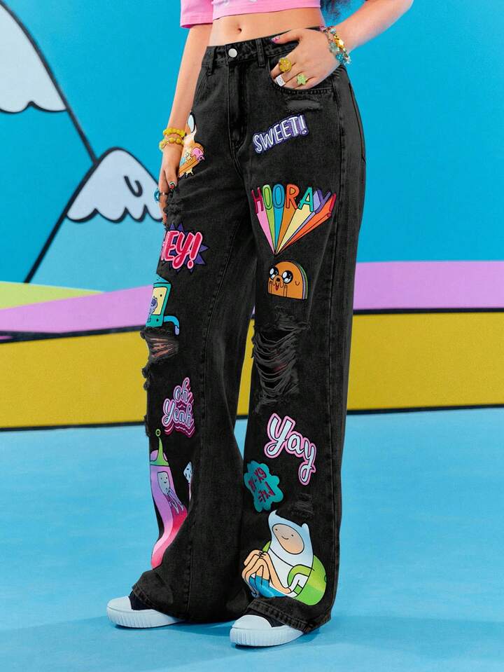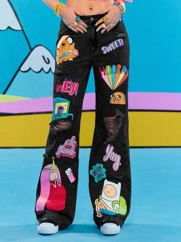 Adventure Time X ROMWE Women Casual Ripped Cartoon Graphic Loose Fit Jeans