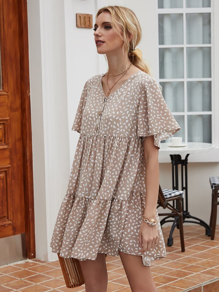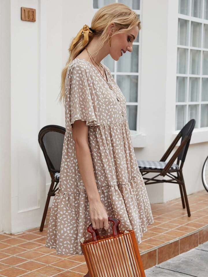 Allover Print Flutter Sleeve Buttoned Babydoll Dress
