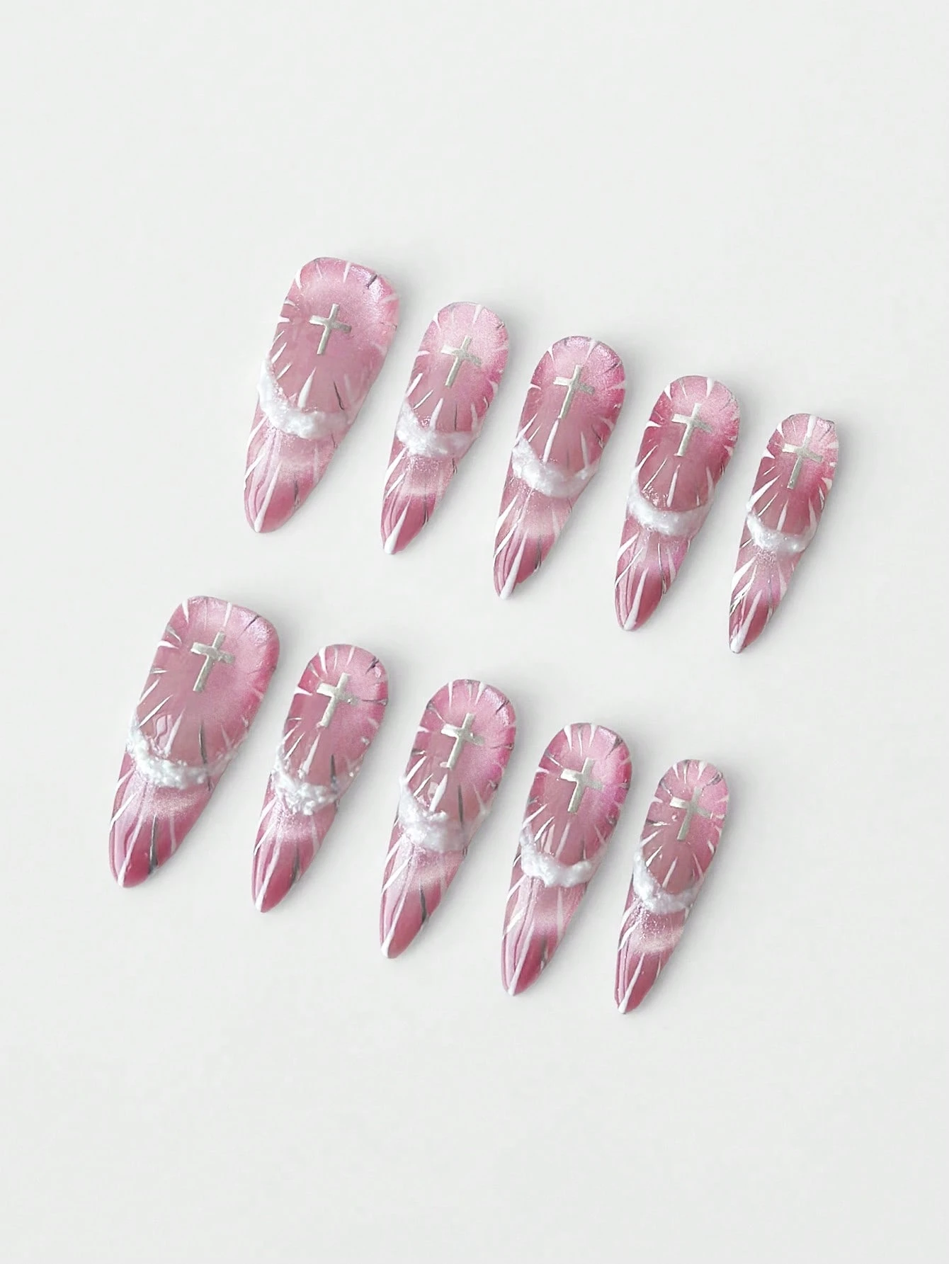 Anime 10 Pieces Of Y2K Style Pink Hand-Painted French Nails+ 3 Pieces Of Double-Sided Tape, High-Quality Cross Pattern Manicure, Pink Cat Eye Removable Long Almond-Shaped Press On Nails. Suitable For Daily Wear, Going Out On Dates