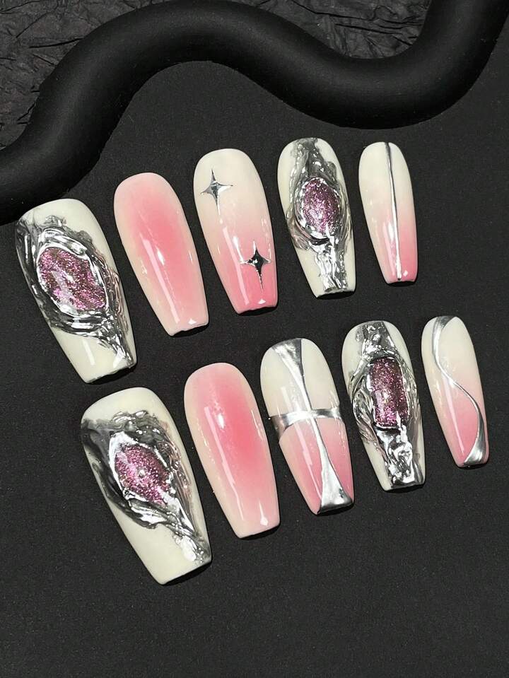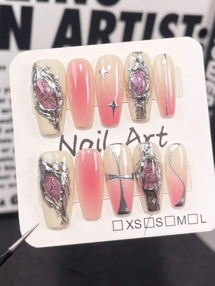 Anime 10pcs Sweet & Cool Metallic Blush & Cat Eye Effect Asymmetric Shaped Nail Art Decoration