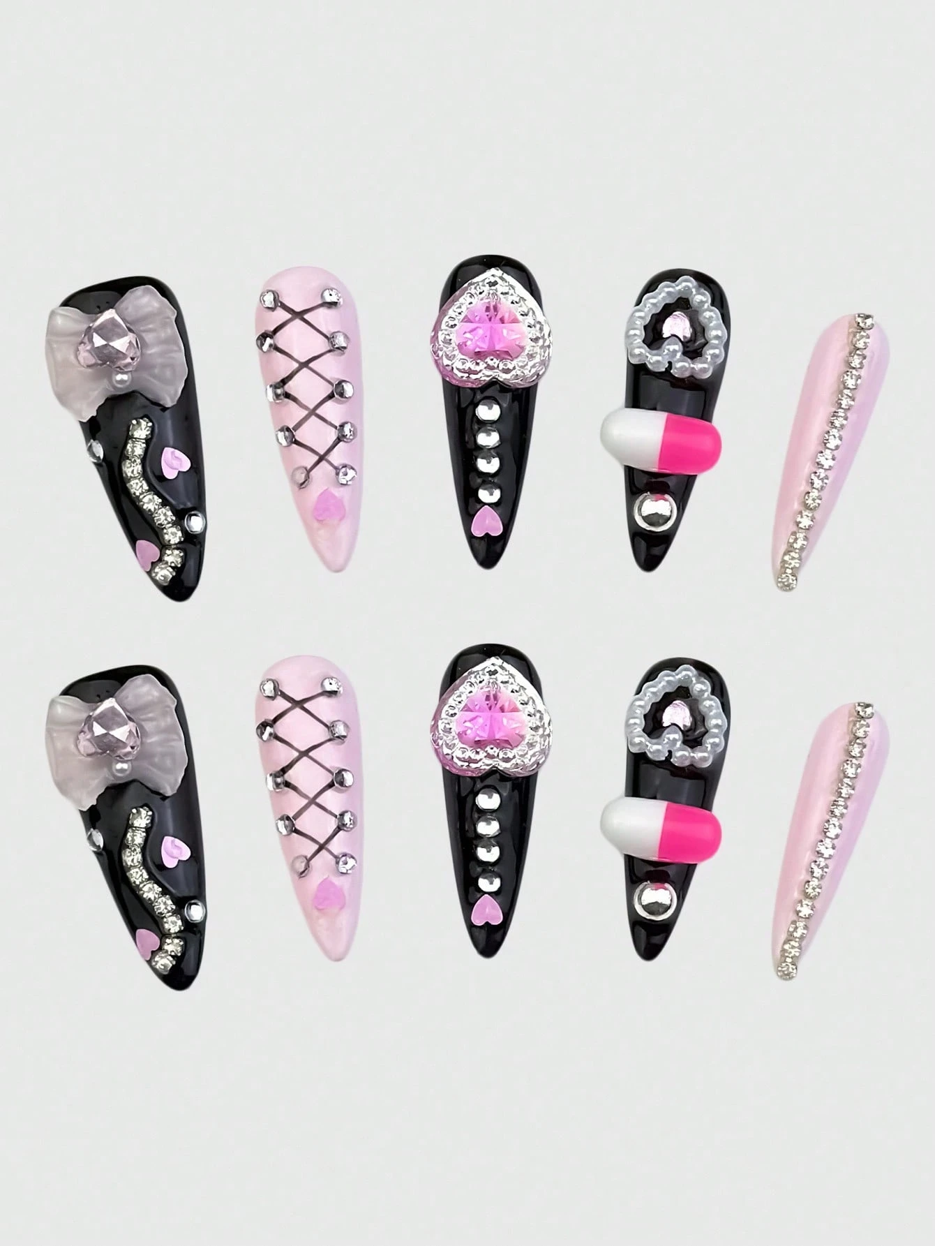 Anime 10pcs Y2K Baddie Heart Chain Bow False Nails With 1pc Nail Tape
