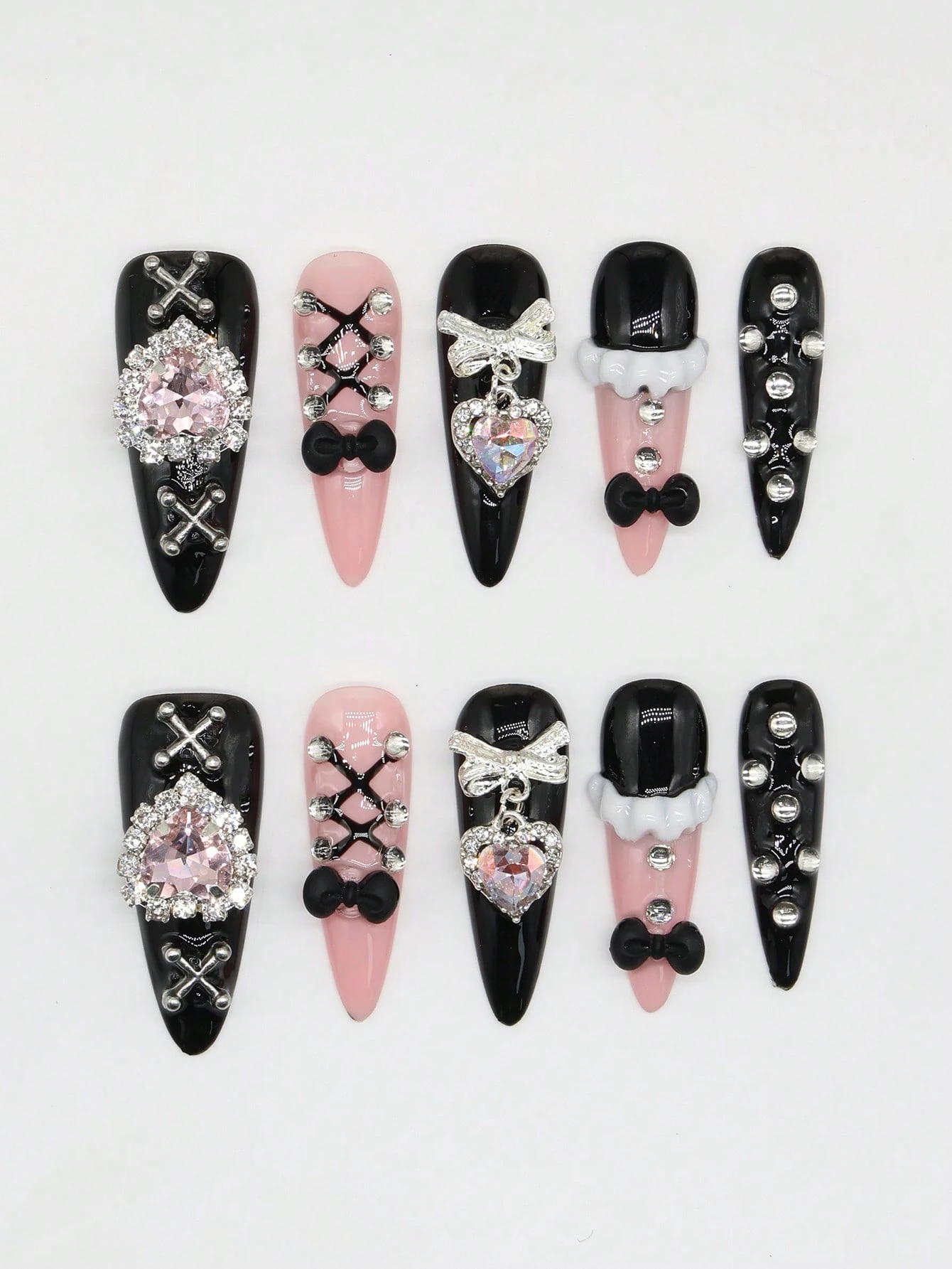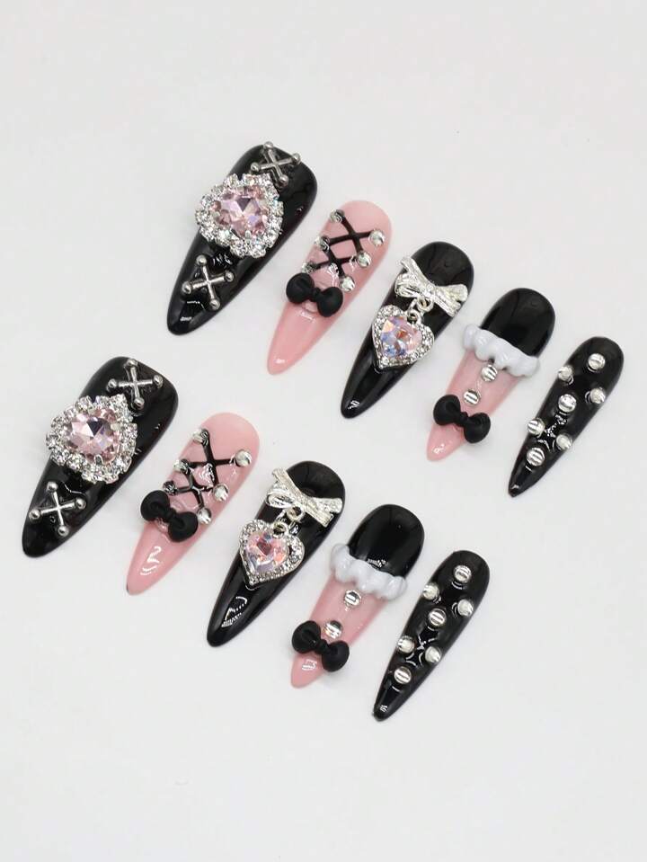 Anime 10pcs Y2K Style Heart Diamond Bow Design Handpainted High-Quality False Nails + 3 Sheets Double-Sided Adhesive, Reusable Pink Nail Jewels Colored Handpainted Nail Stickers, Suitable For Holiday Parties, Dancing And Daily Wear