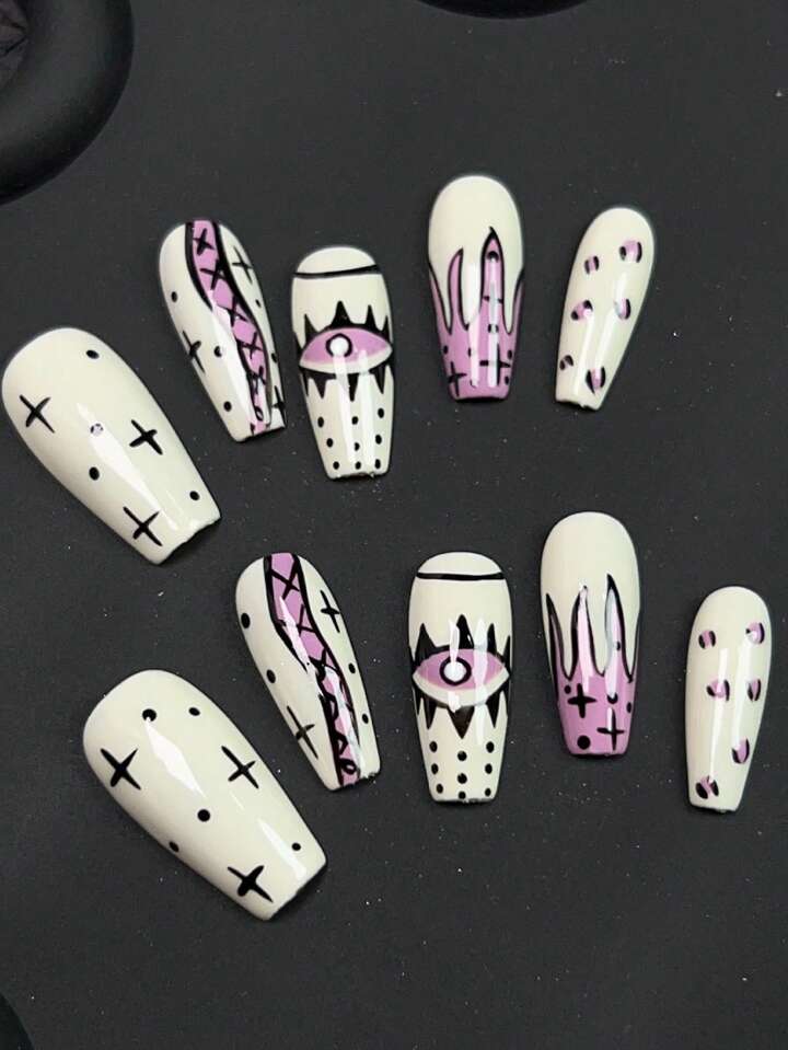 Anime 1pc 10pcs All-covered False Nails With Eye & Polka Dot Pattern