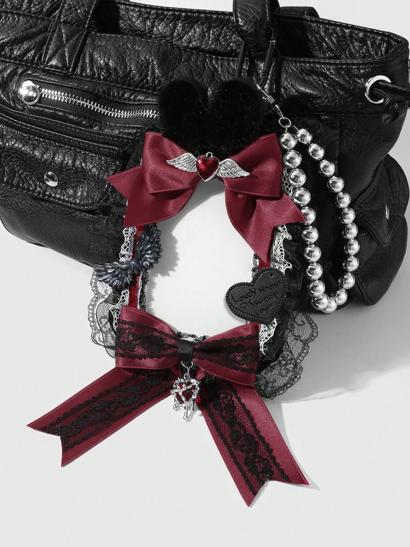 Anime 1pc Y2K Goth Style Handmade Beaded Necklace With Silver CCB, Black & White Lace, Faux Fur, Red Ribbon Bow, Acrylic Wings, Liquid Chain, Leather Letters, Heart, White Acrylic Card Holder, Suitable For Students, Idol Fans, Women, Daily Wear, Holiday Gift