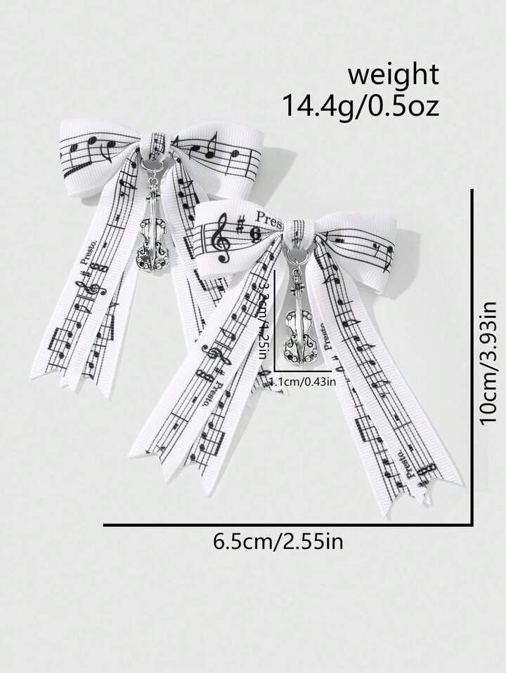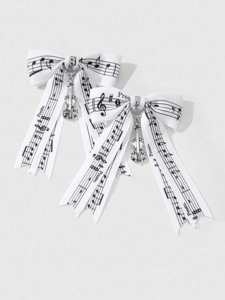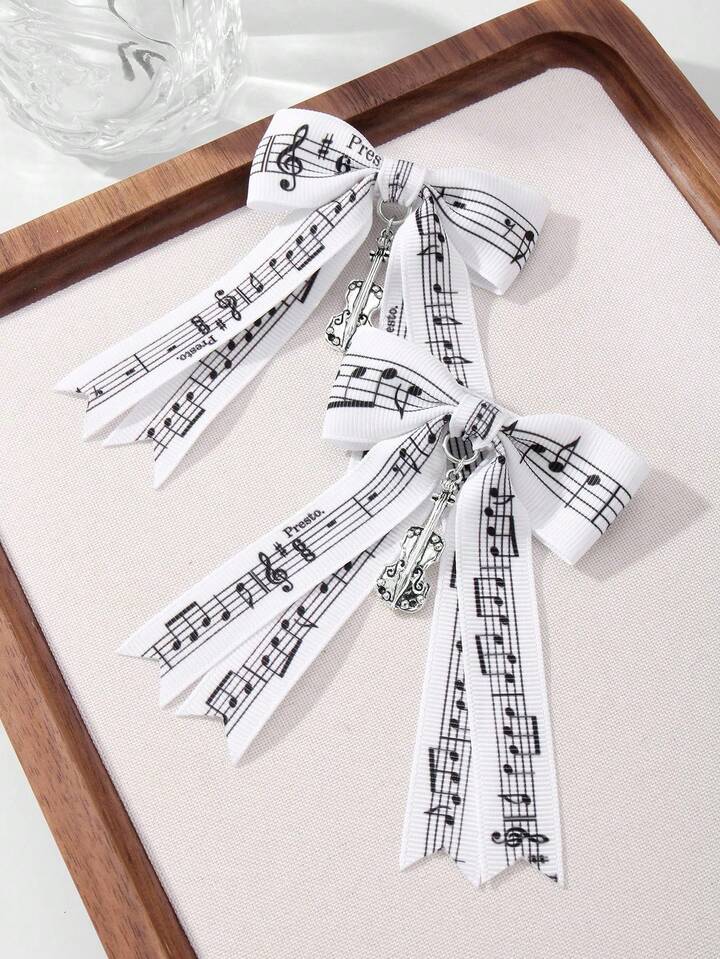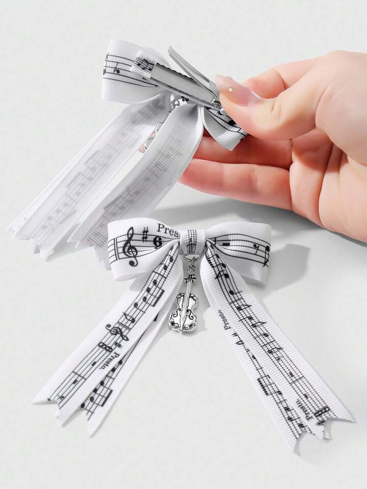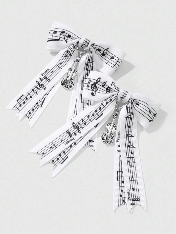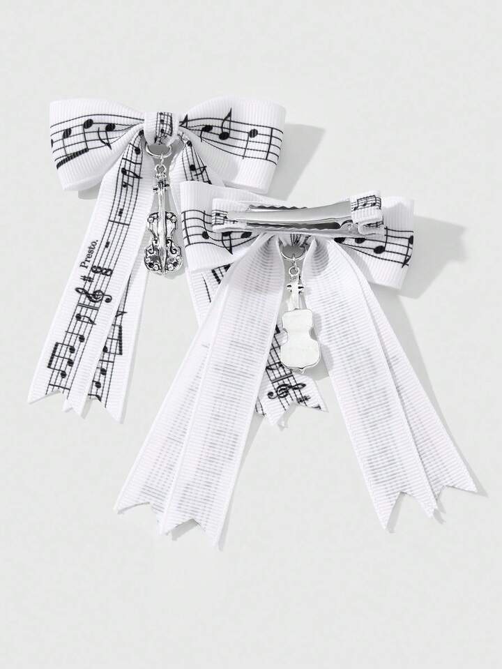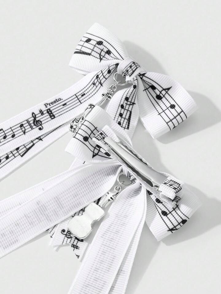 Anime 2pcs Elegant Minimalist Versatile Retro Fashion High-Quality Black & White Ribbon Printed Musical Note Bowknot Guitar DIY Hair Clips Barrettes Set, Suitable For Women & Girls, Great Gift For Holidays