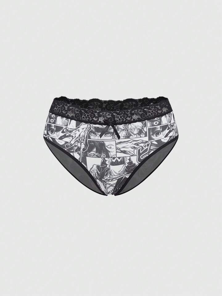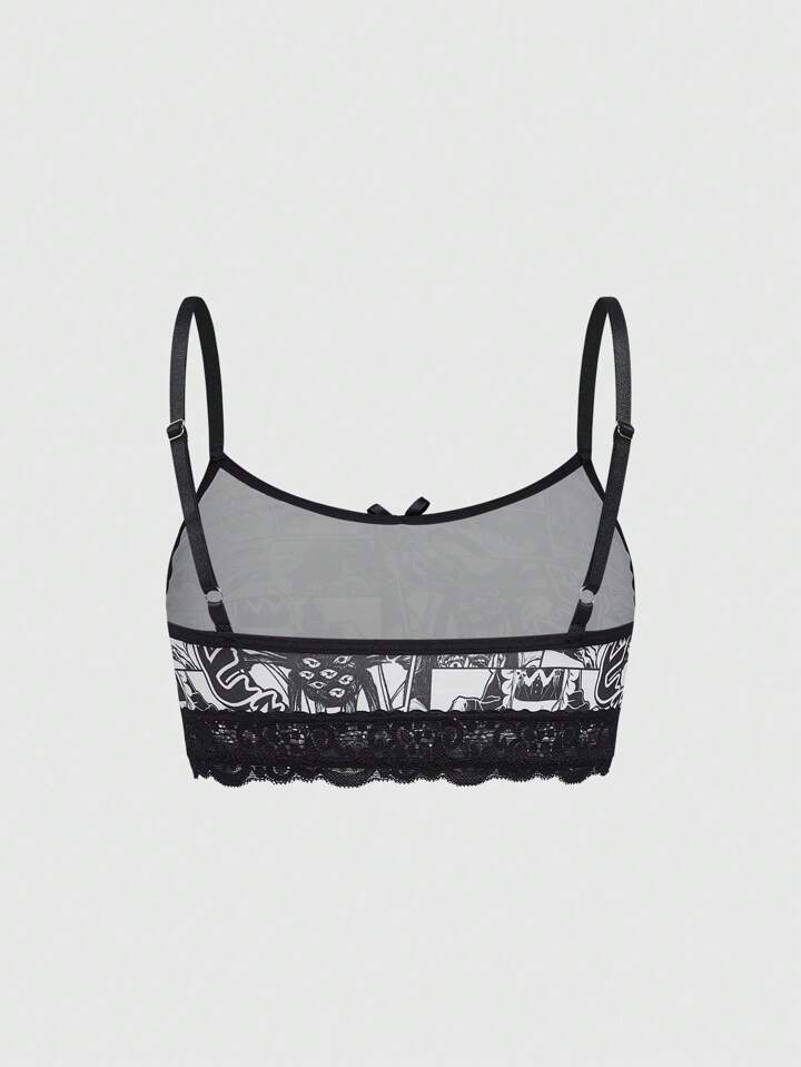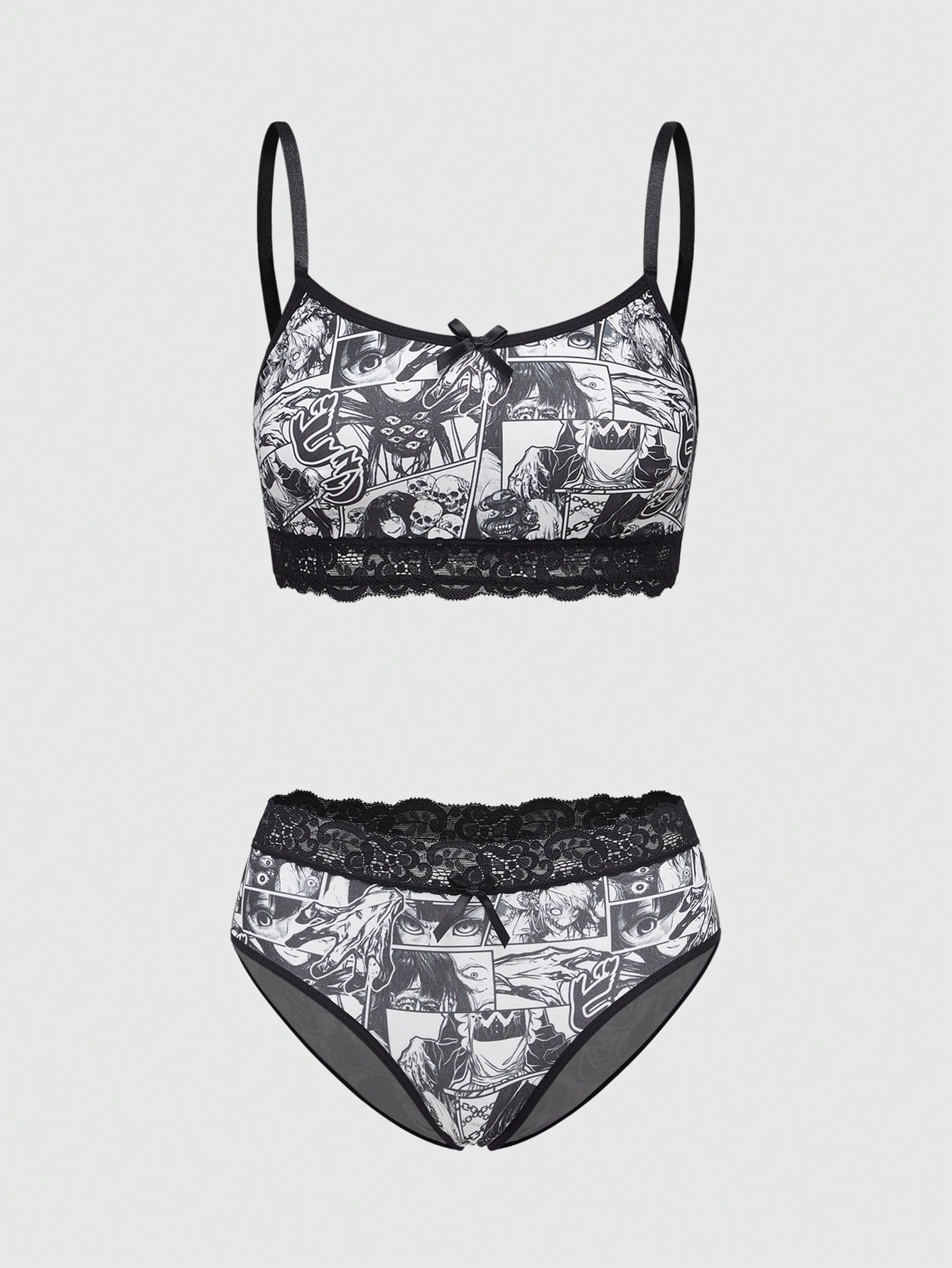 Anime Full Print Lace Patchwork Wireless Lingerie Bra And Panty Set For Women