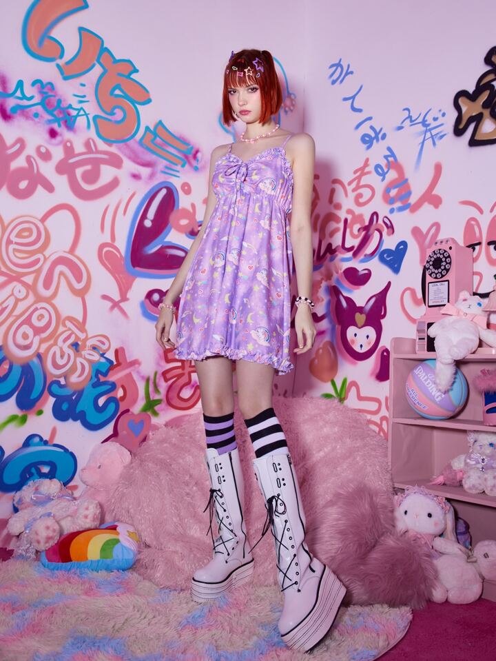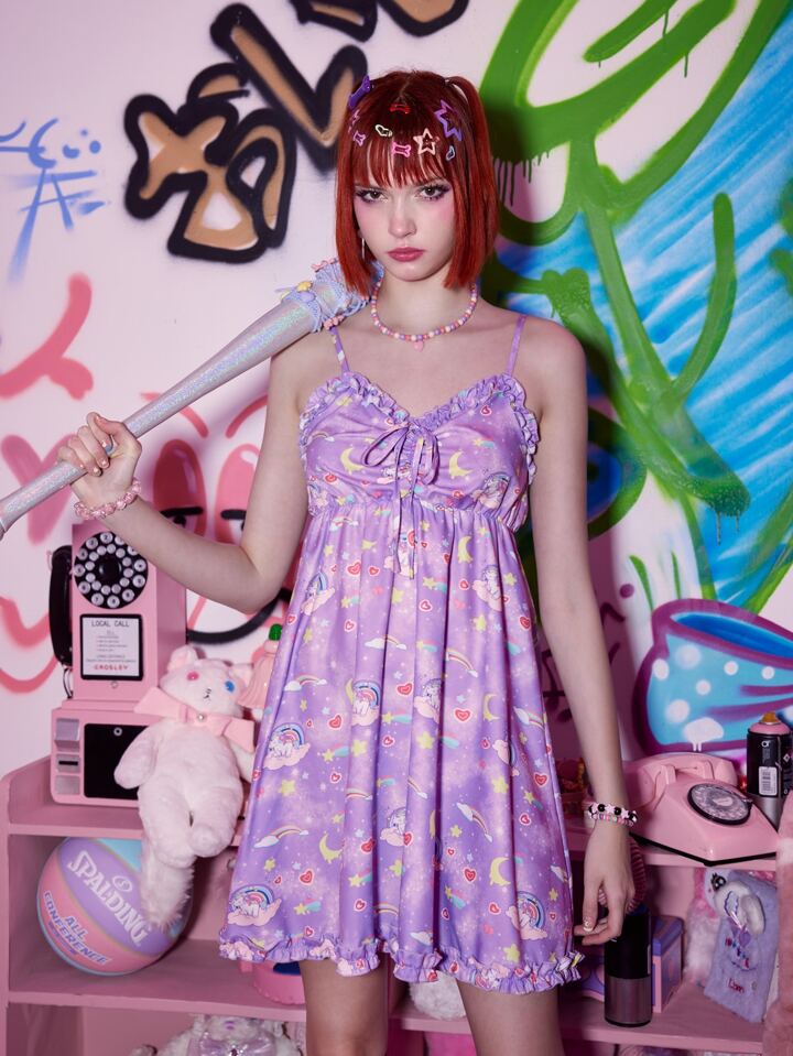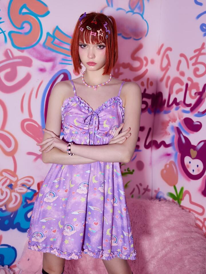 Anime Cartoon Graphic Frill Trim Knot Front Cami Dress