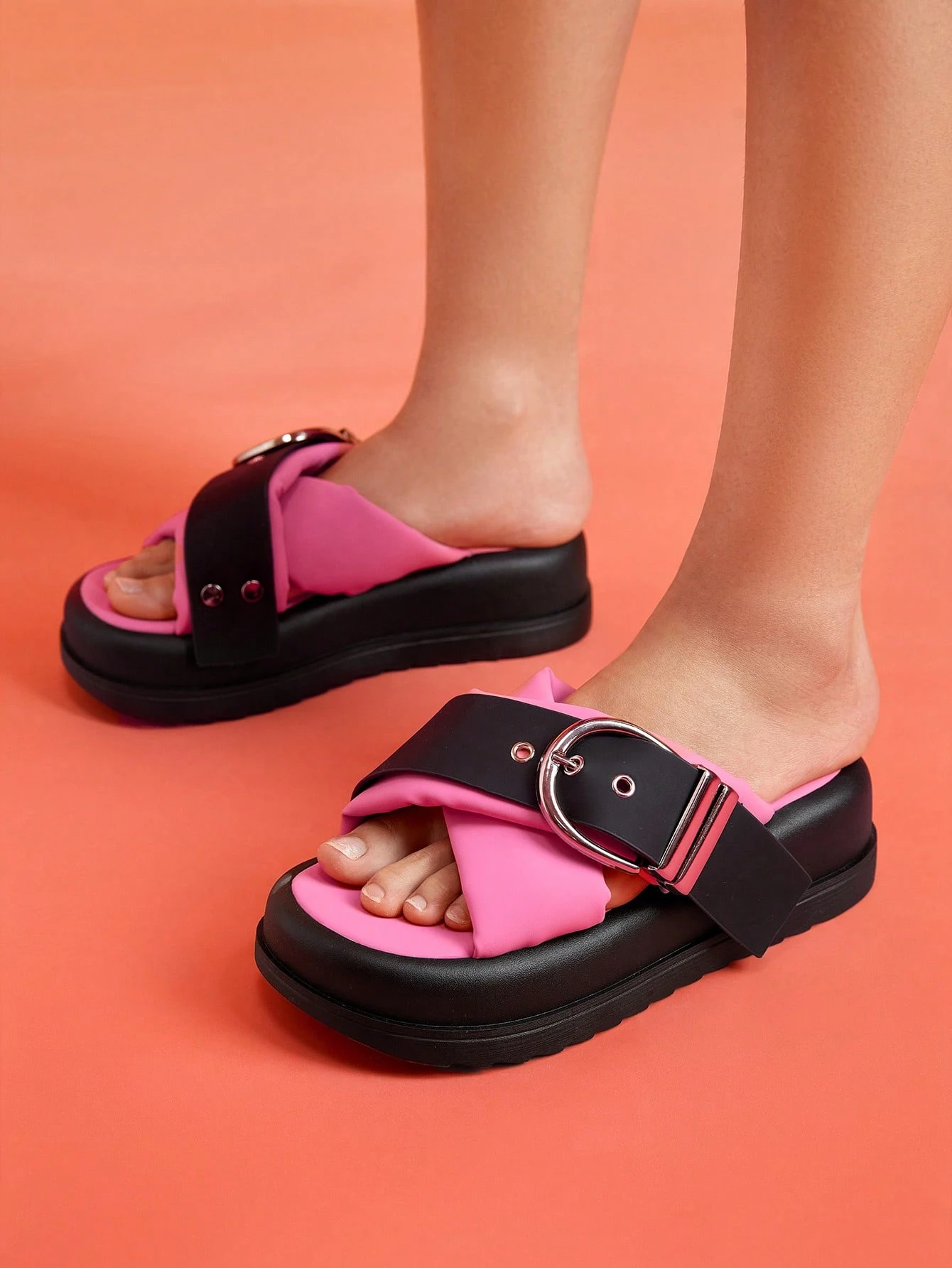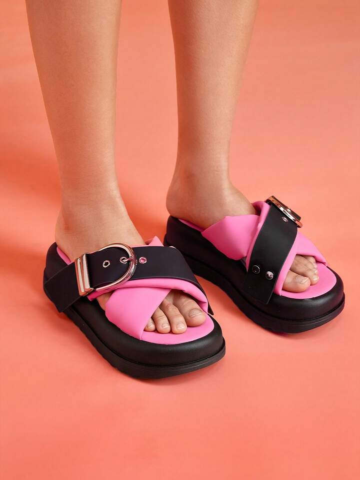 Anime Fashion Sandals For Women, Two Tone Buckle Decor Flatform Slide Sandals