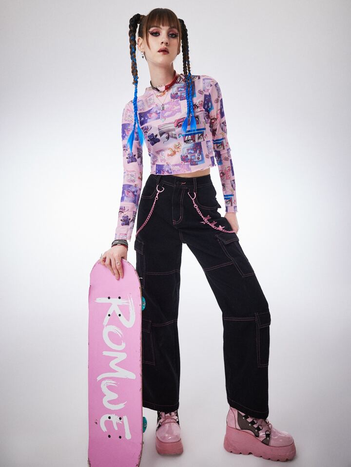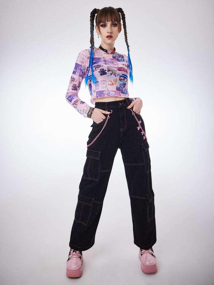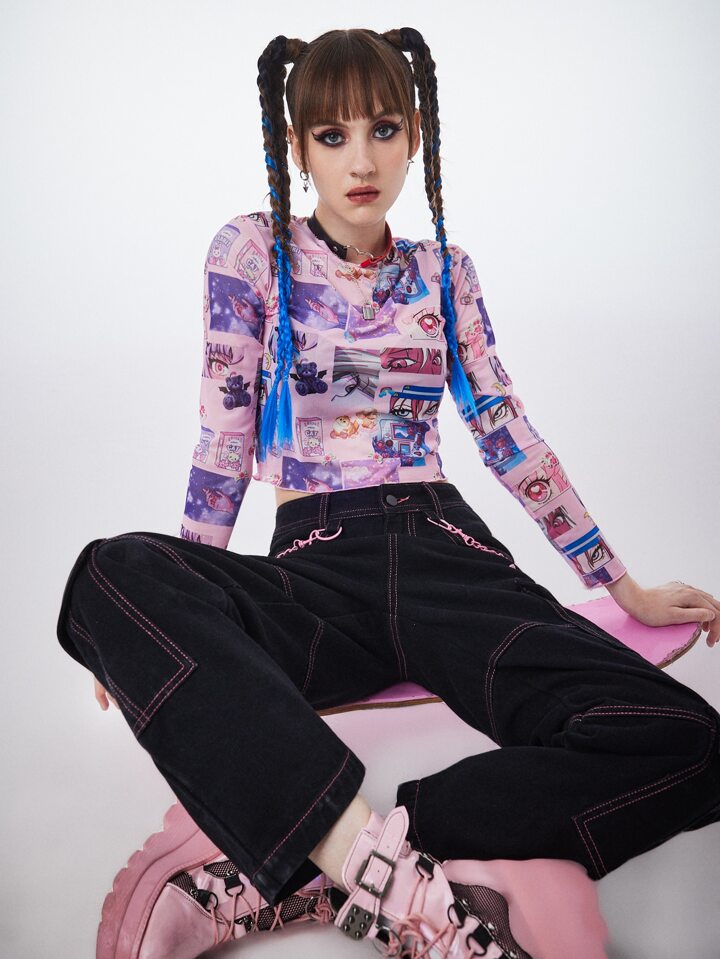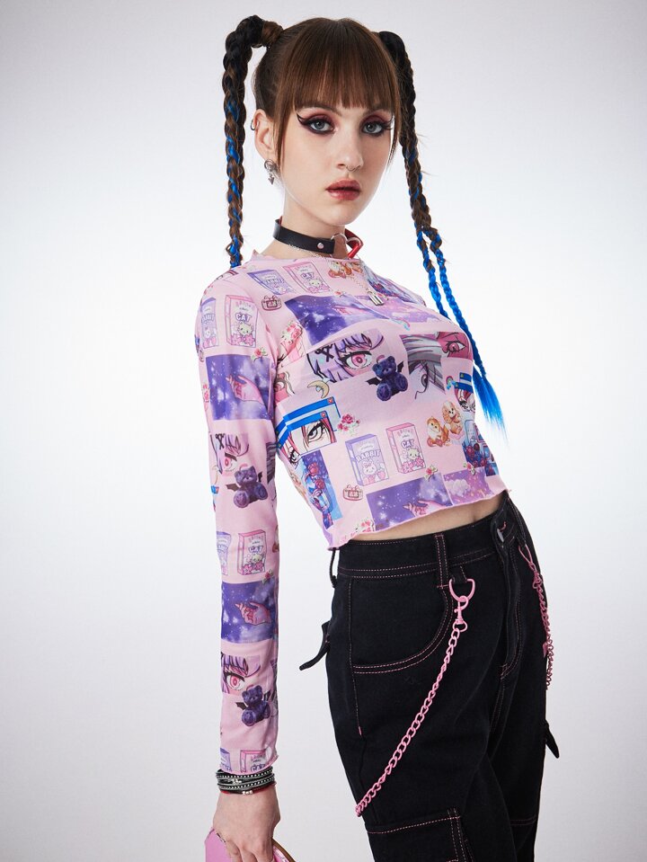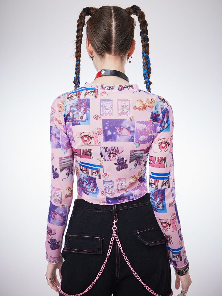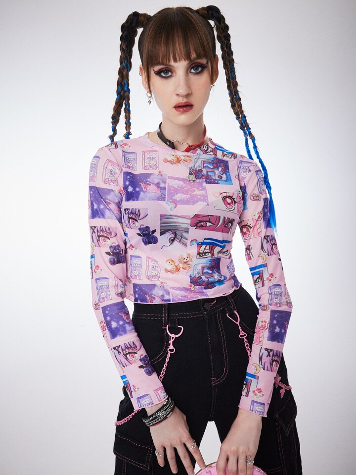 Anime Figure & Letter Graphic Mesh Top