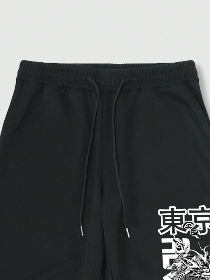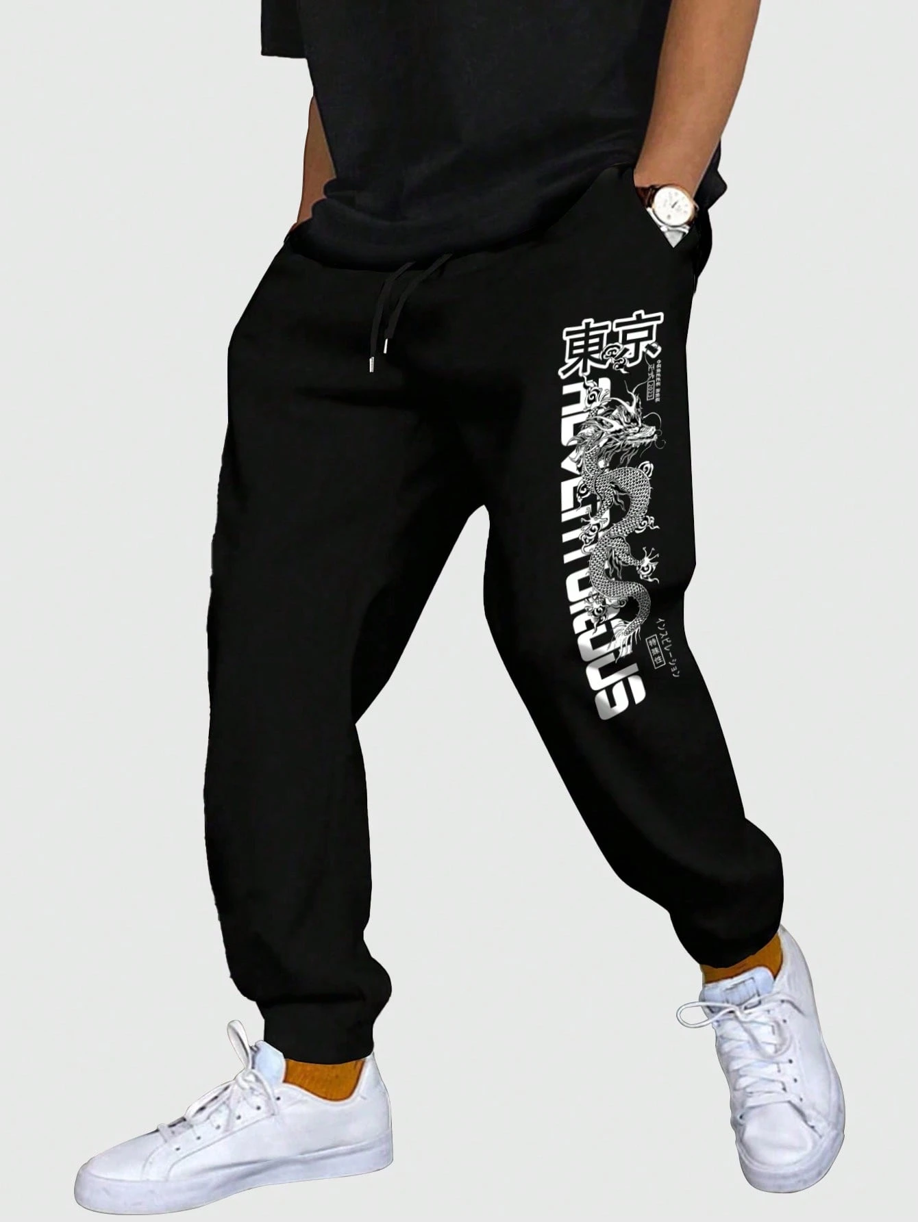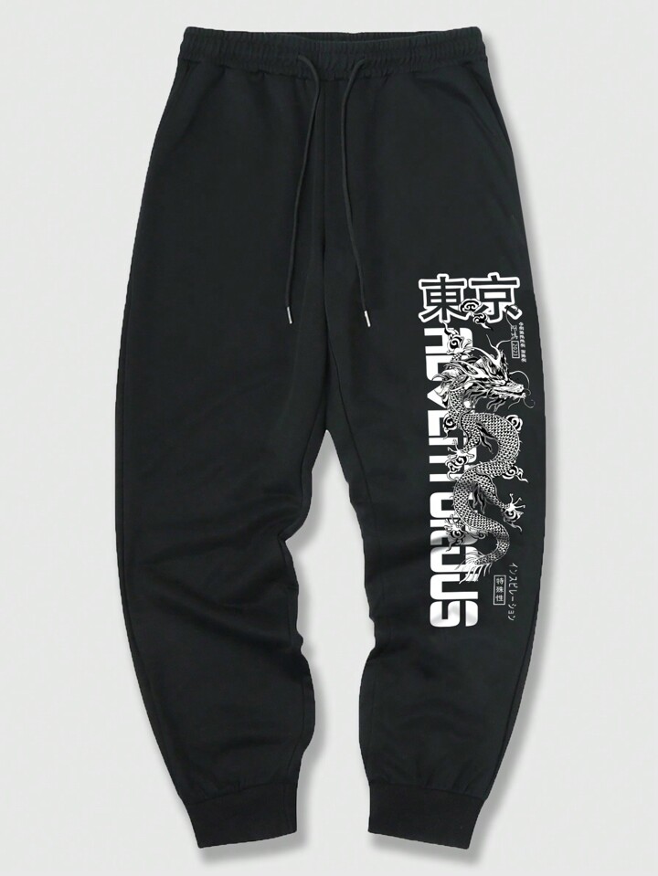 Anime Guys Letter & Dragon Graphic Drawstring Waist Sweatpants