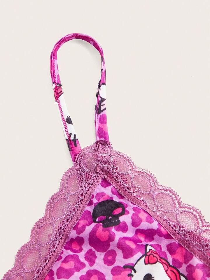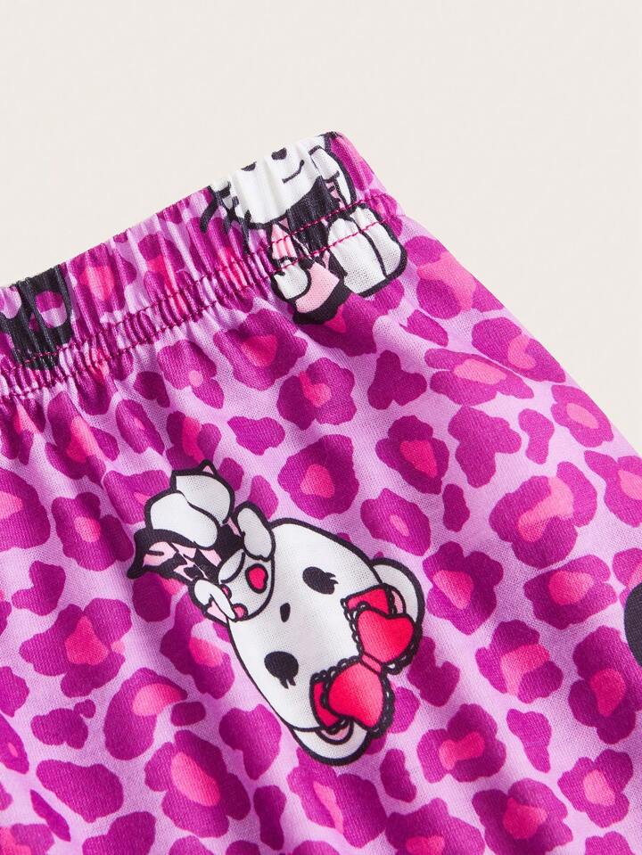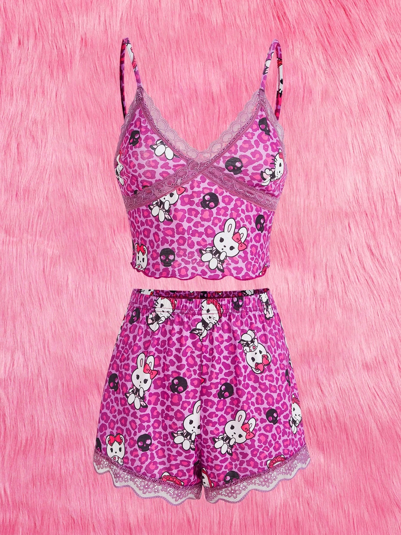 Anime Leopard Cartoon Graphic Contrast Lace PJ Set