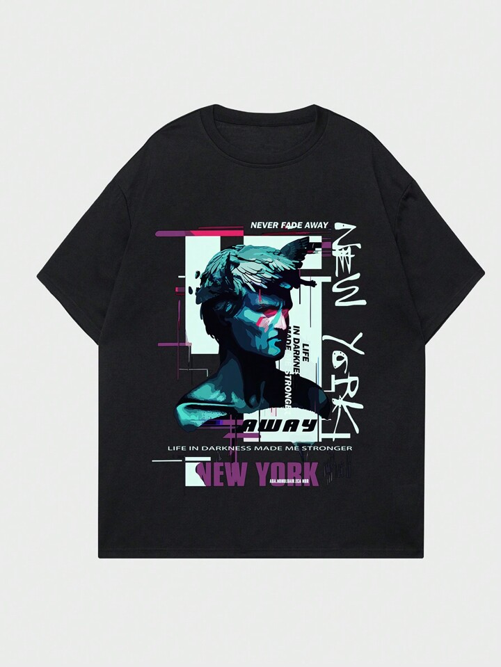 Anime Men Sculpture Print Drop Shoulder Short Sleeve T-Shirt With Slogan