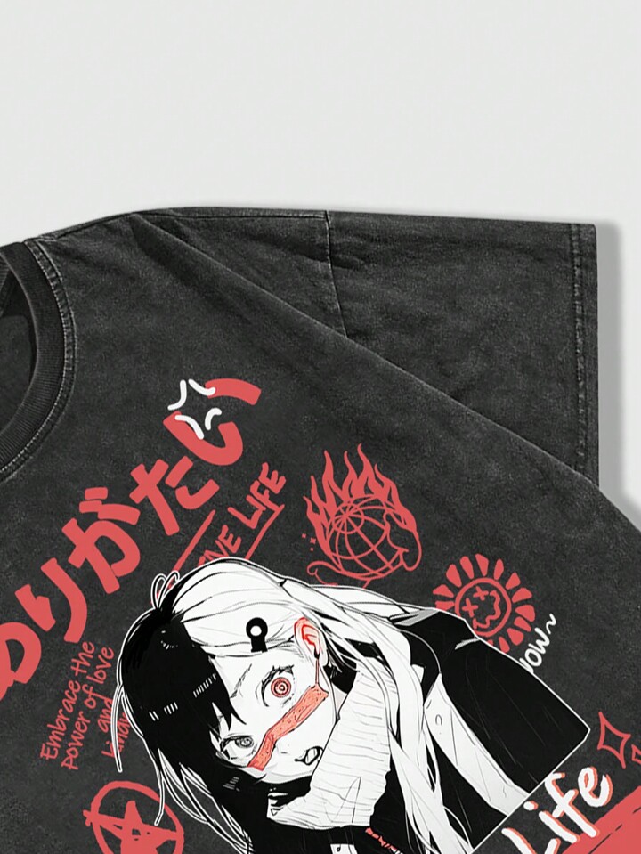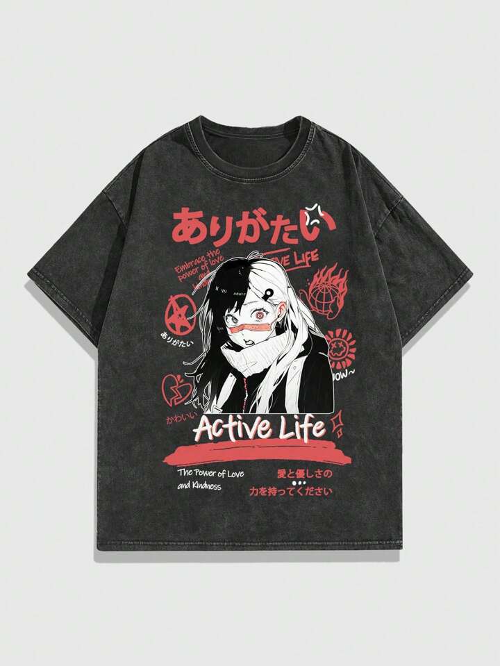 Anime Men's Acid-Washed 2d Printed Short Sleeve T-Shirt Suitable For Daily Wear In Spring And Summer