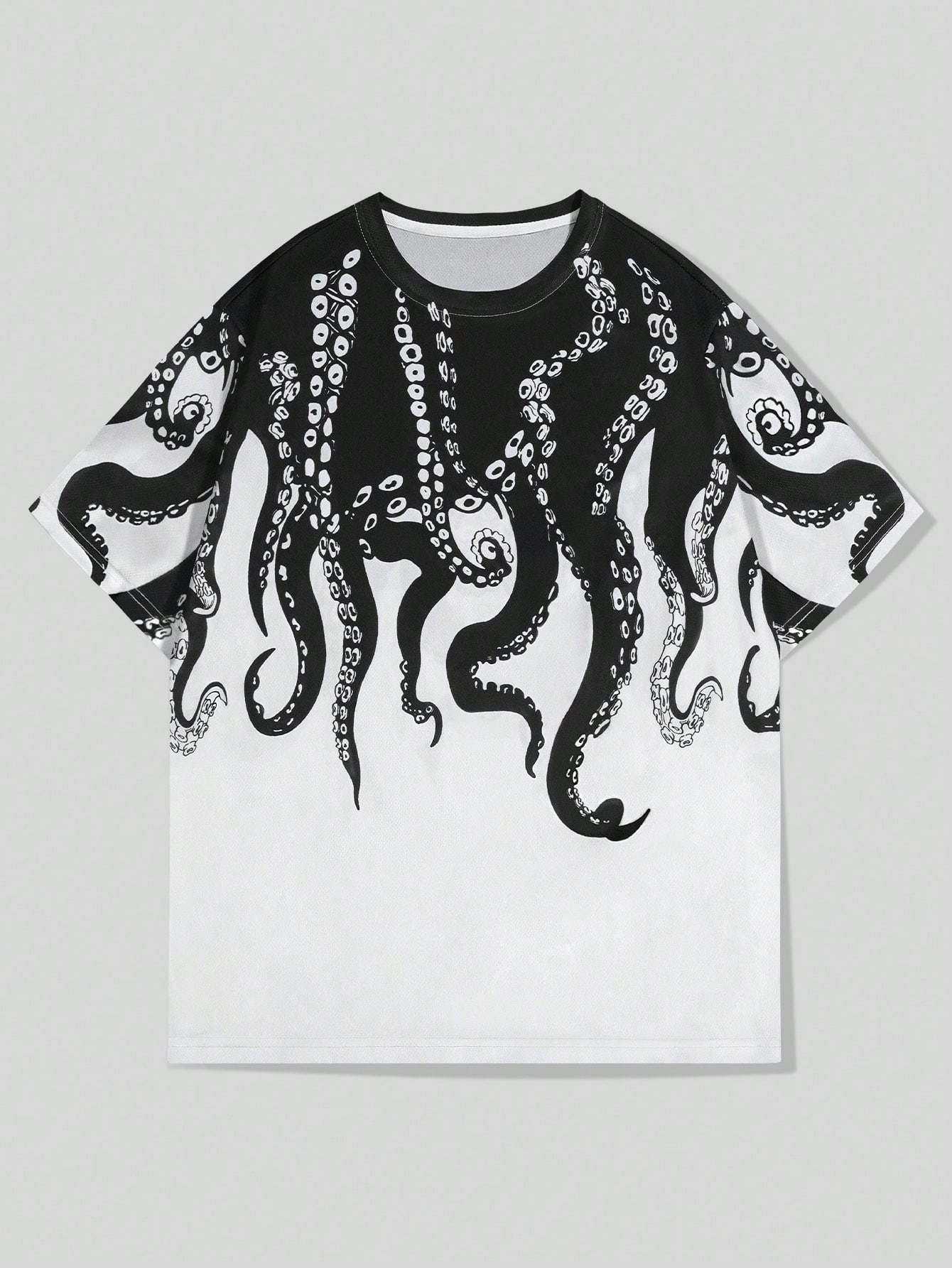 Anime Men's Casual Contrast Color Octopus Print Short Sleeve T-Shirt, Summer