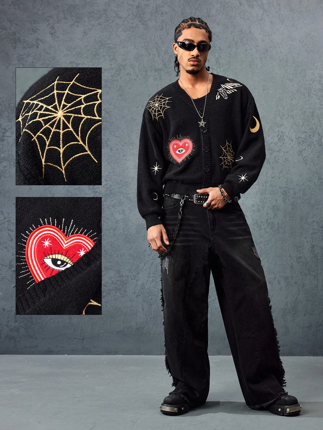 Anime Men's Heart Eye Spider Web Embroidery Cardigan