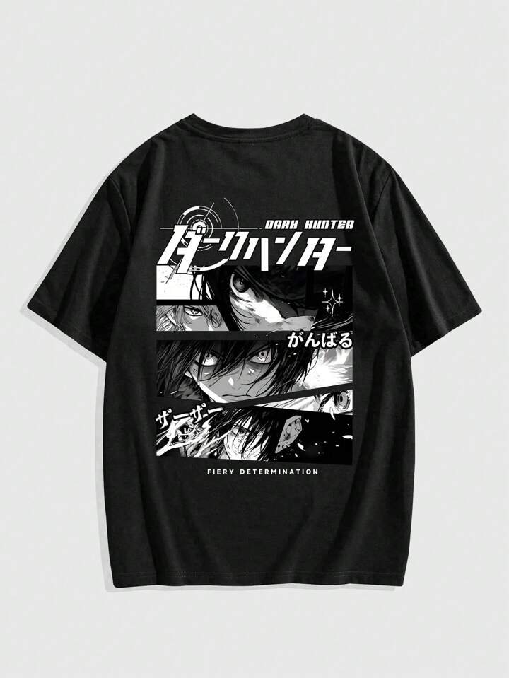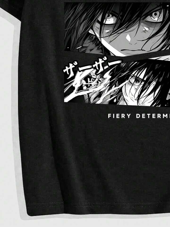 Anime Men's Portrait And Japanese Character Print Short Sleeve T-Shirt