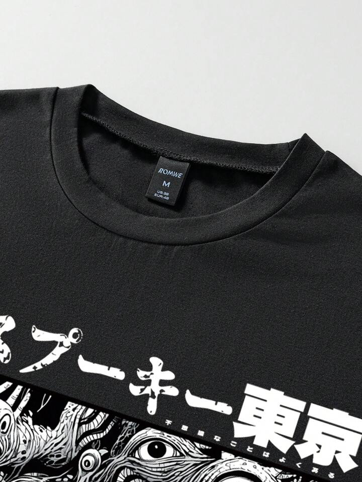 Anime Men's Sleeveless Tank Top With Cartoon Character Eye & Japanese Text Print