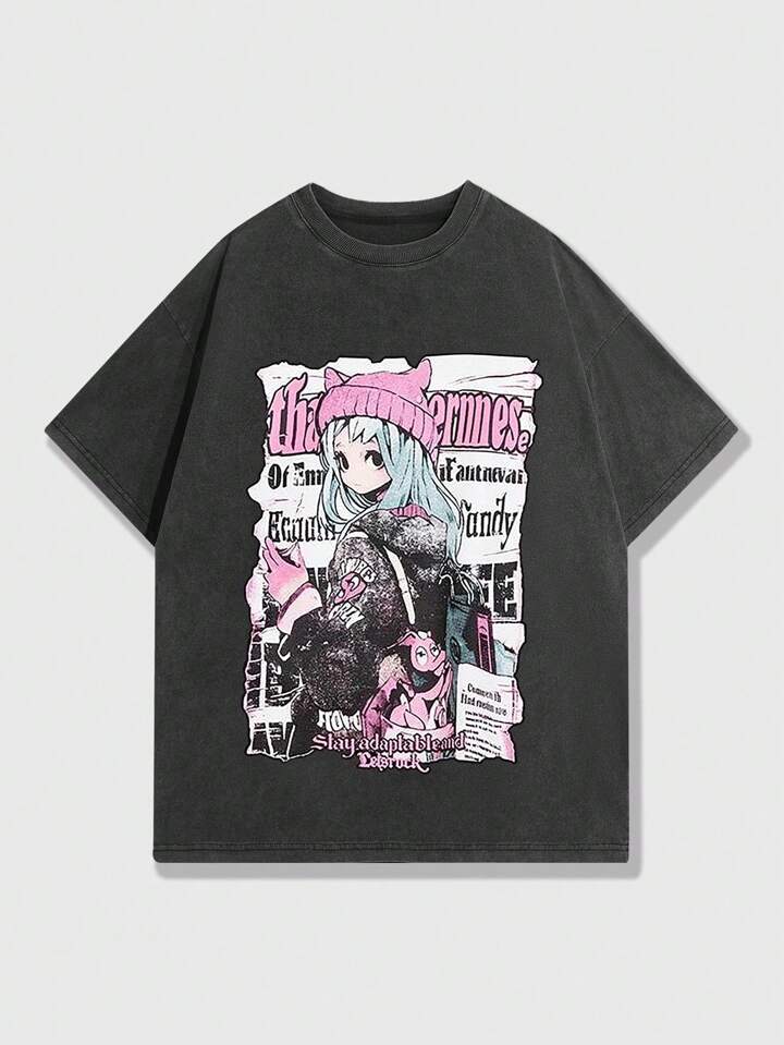 Anime Men's Vintage Chopped Snowflake Purple Water Distressed T-Shirt With Cartoon Character Prints, Summer