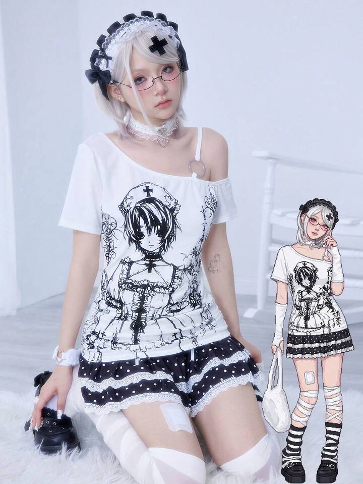 Anime Millennium Cartoon Vine Cross Strap Short Sleeve Elastic Ruched Women T-Shirt