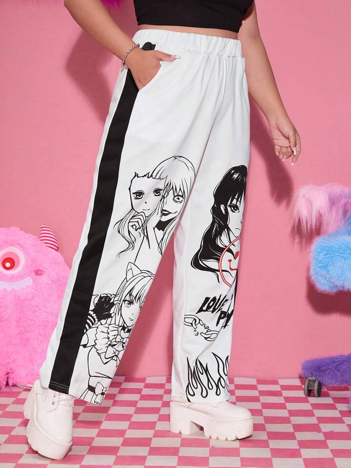 Anime Plus Figure & Letter Graphic Contrast Side Seam Sweatpants