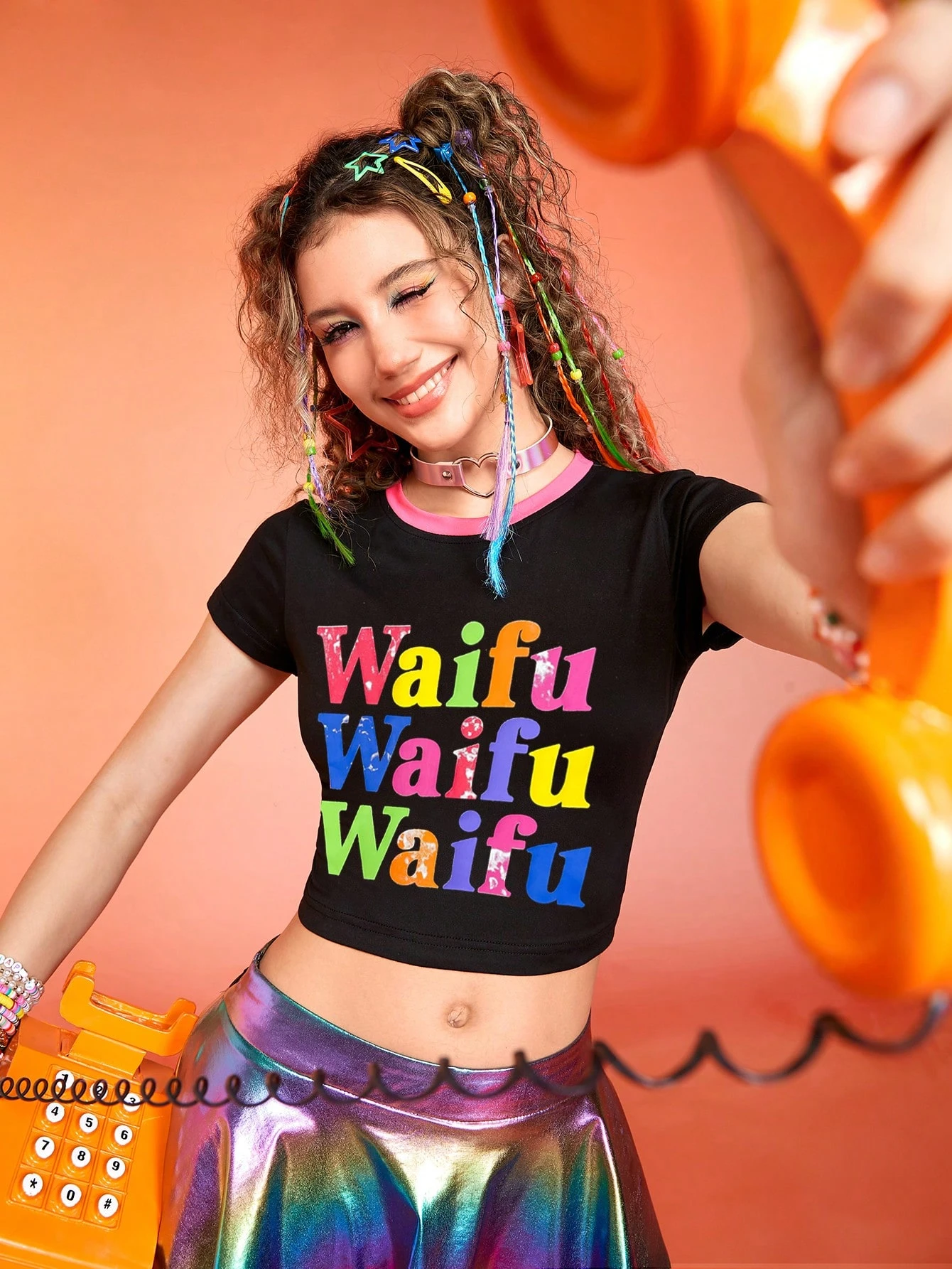 Anime Slogan Graphic Contrast Binding Crop Tee