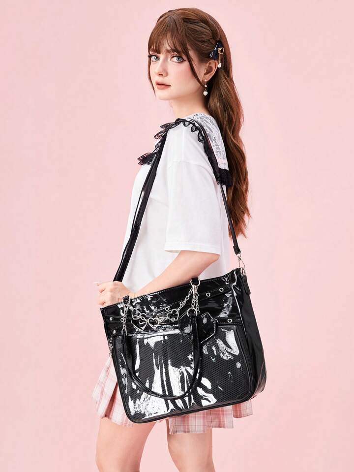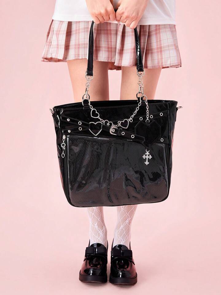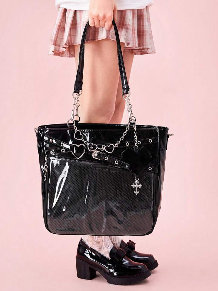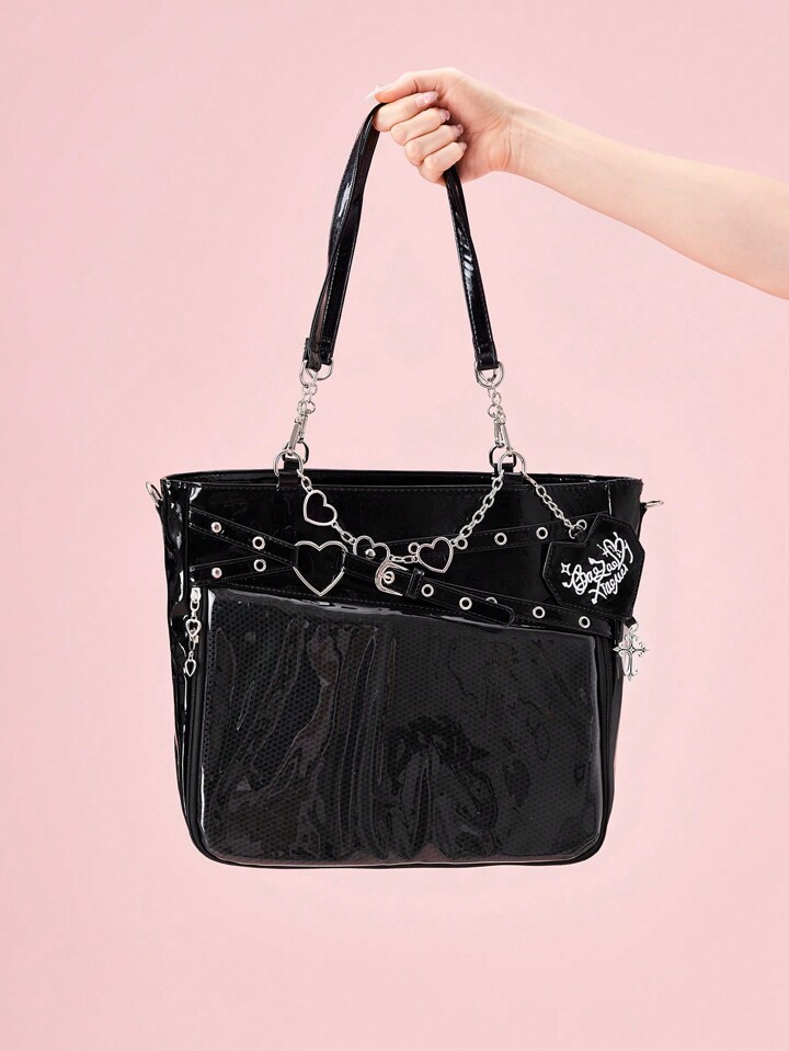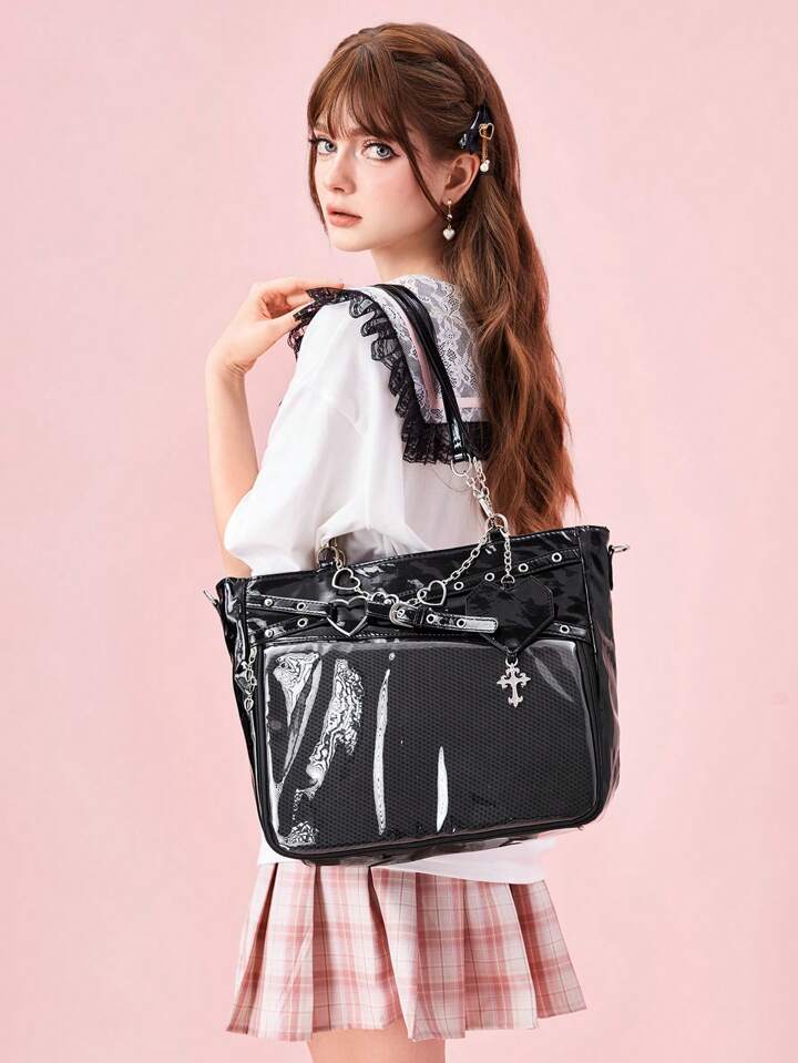 Anime Women's Y2K Punk Style Clear Layer Big Capacity Tote Bag, Lolita Heart Chain Shoulder Bag