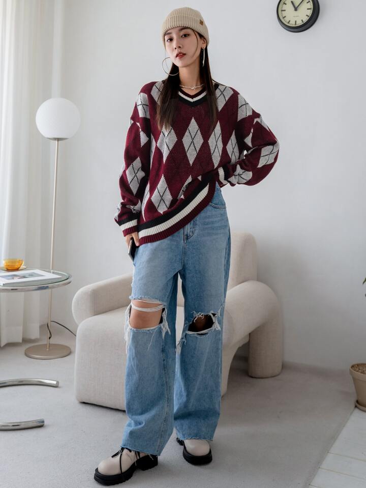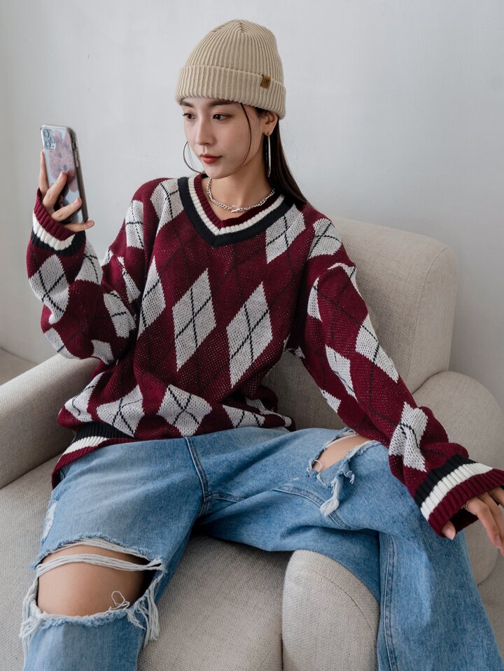 Argyle Pattern Drop Shoulder Oversized Sweater