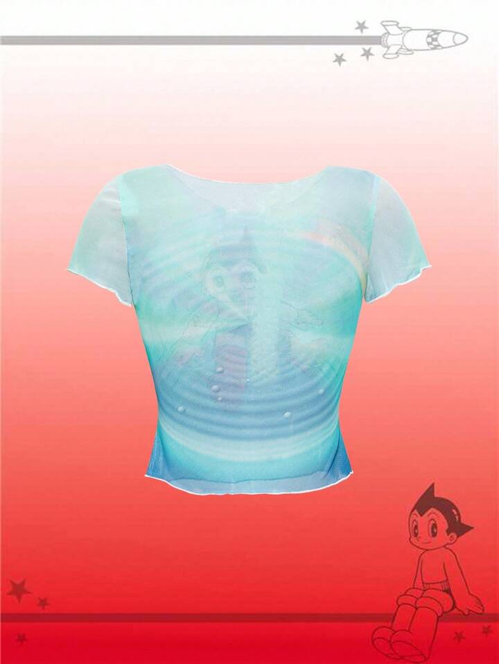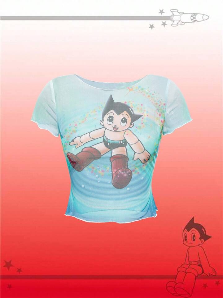 Astro Boy X ROMWE Cartoon Figure Graphic Sheer Sexy & Cute Short Sleeve Women T-Shirt