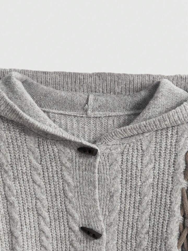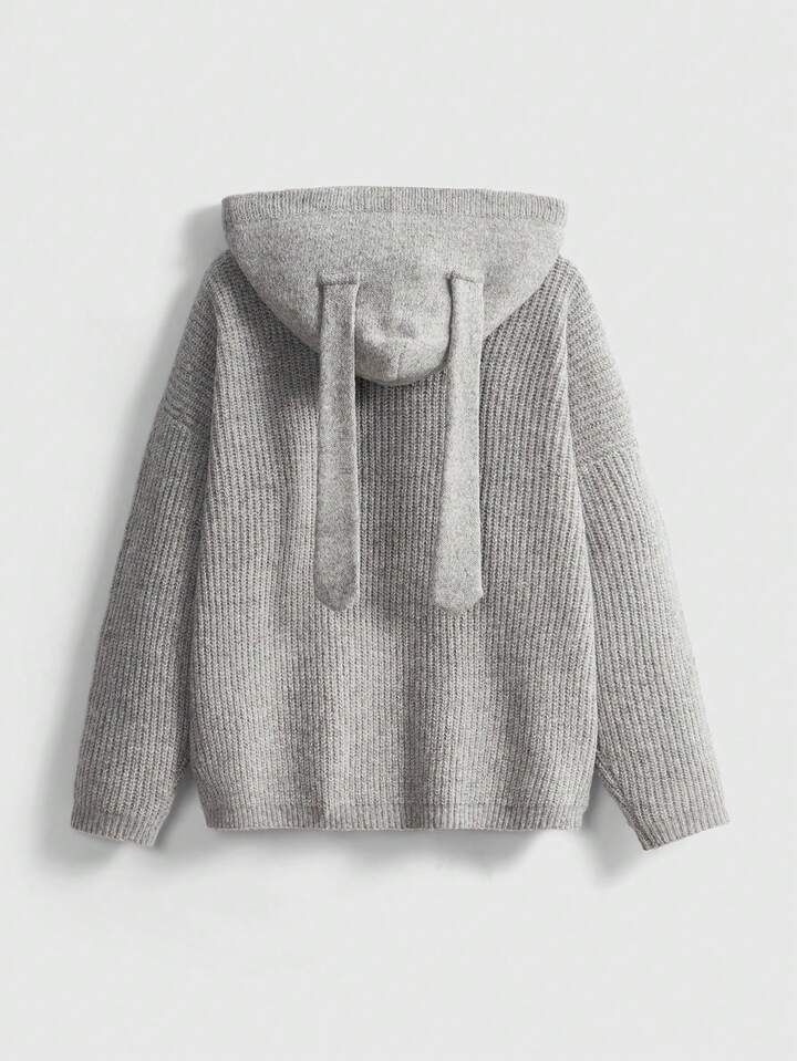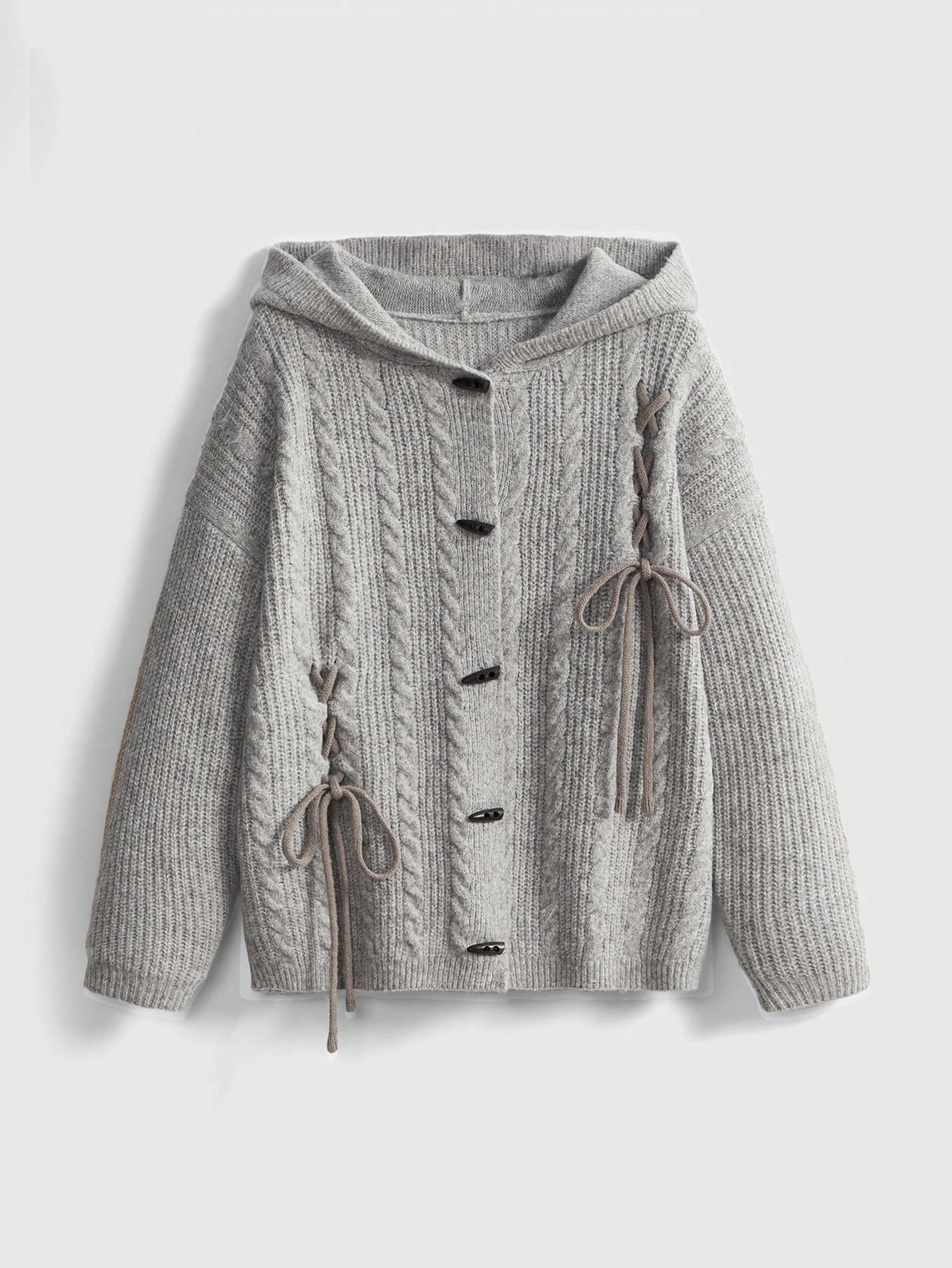 Autumn/Winter Cute Rabbit Ear Hooded Knit Cardigan For Women, Loose Fit, Horn Button, Side Tie Design Sweater Jacket