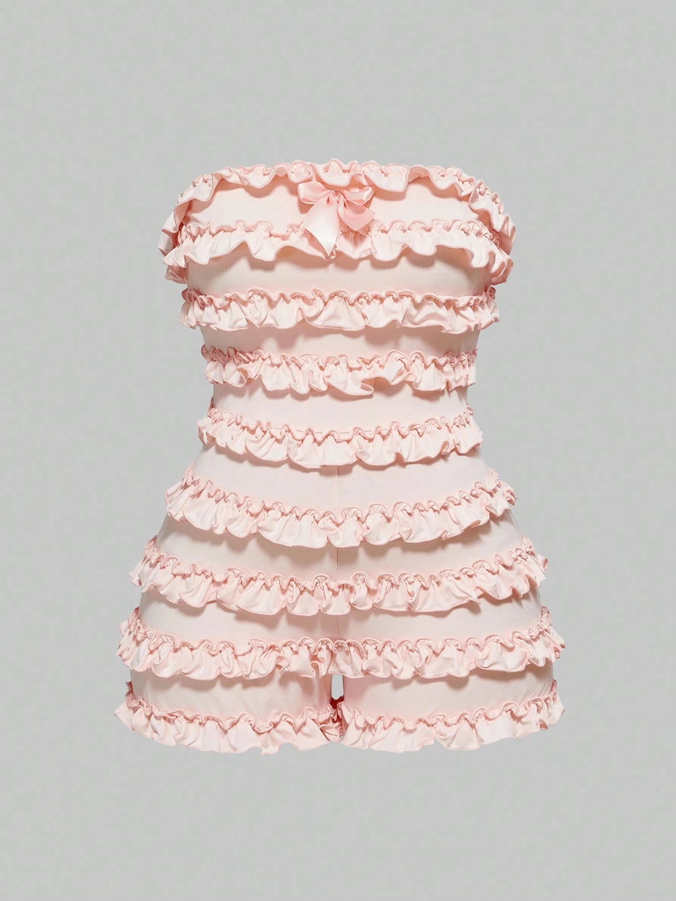 Grunge Punk Back To School Summer Y2K Streetwear Babydoll Ruched Layered Cake Mini Romper, Black Solid Color Plus Size