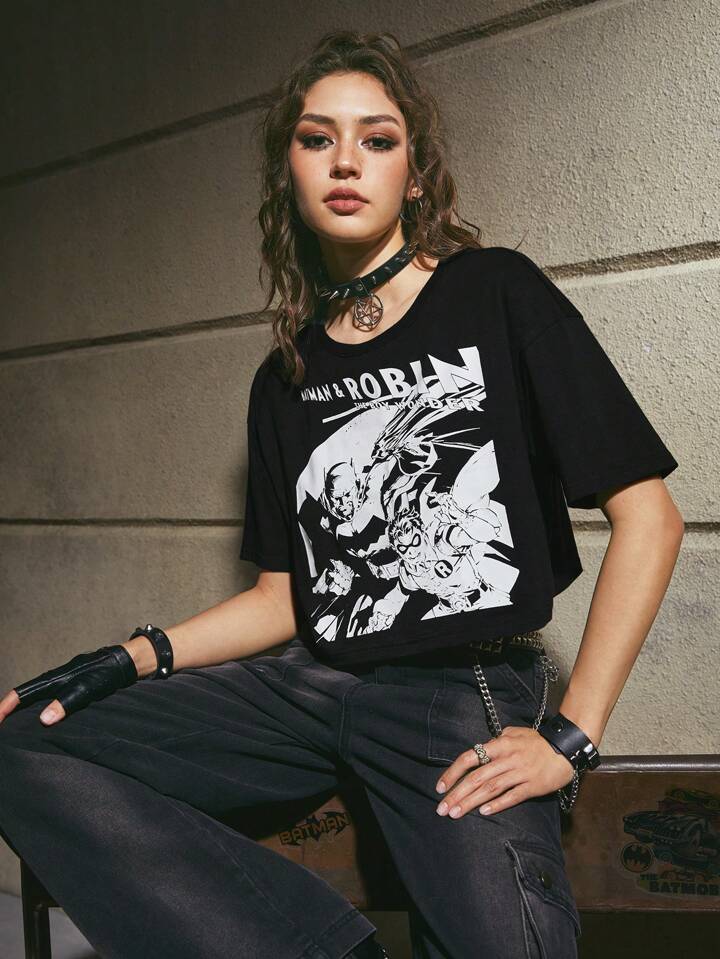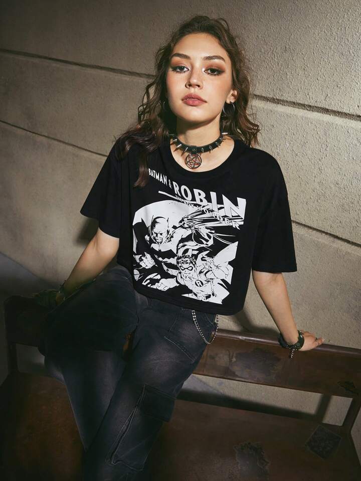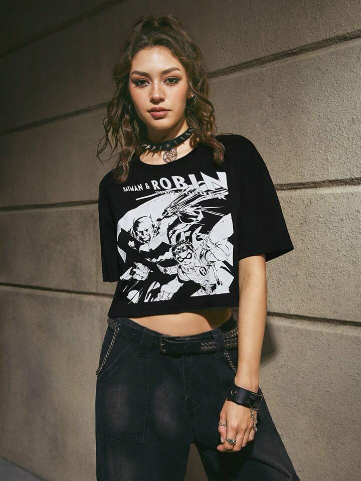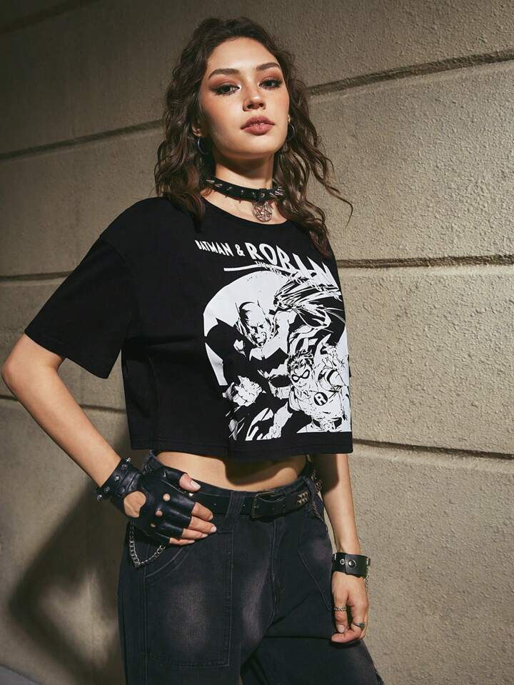 Batman X ROMWE Cartoon Figure & Letter Graphic Crop Tee