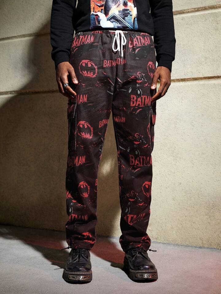 Batman X ROMWE Guys Letter & Cartoon Graphic Drawstring Waist Cargo Pants