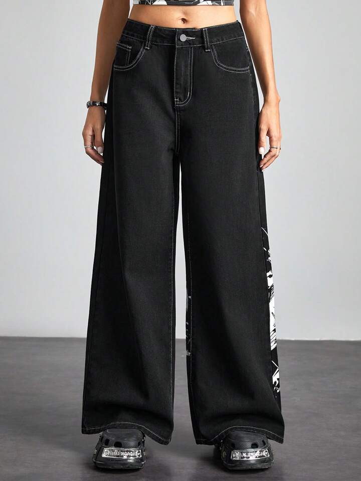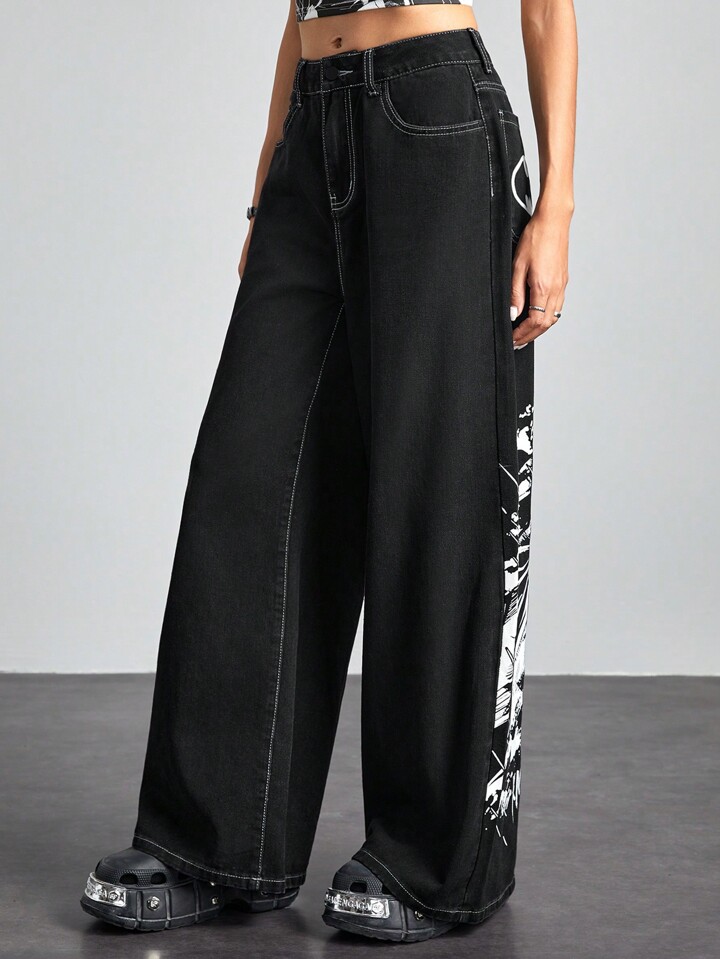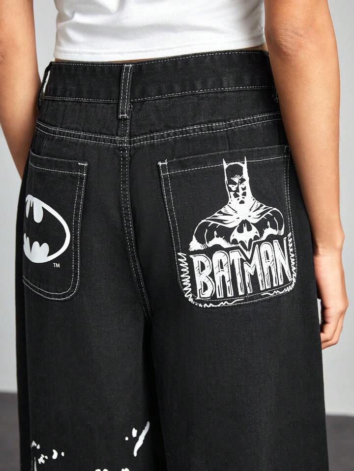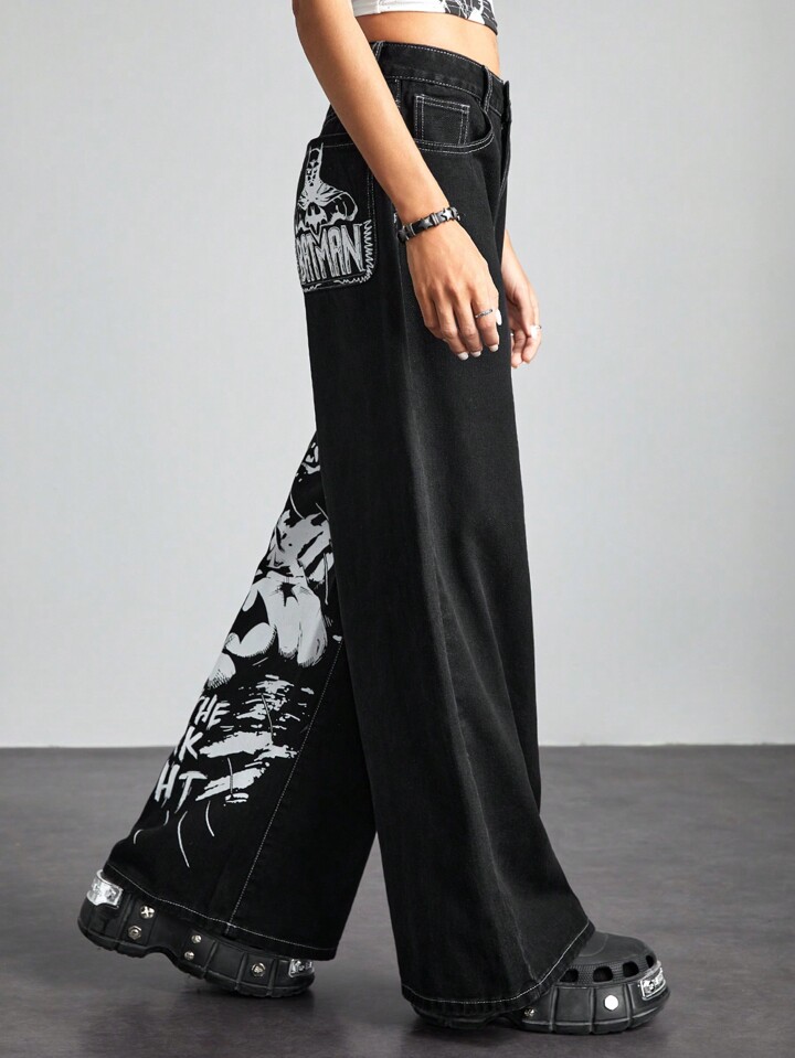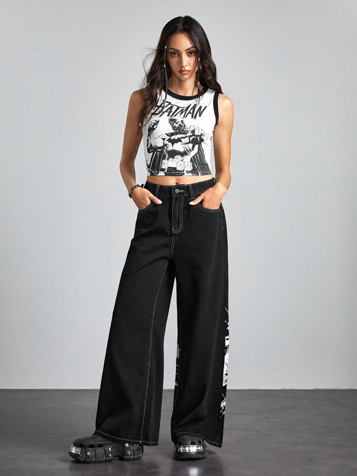 Batman X ROMWE Women's Loose Fit Wide Leg Jeans With Topstitching, Streetwear