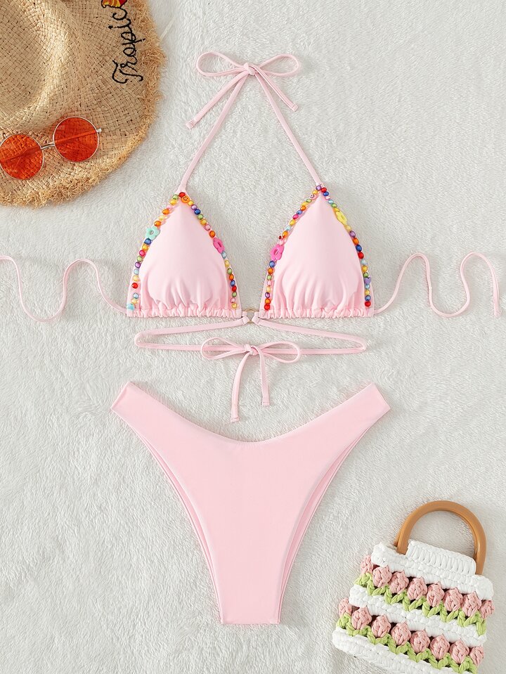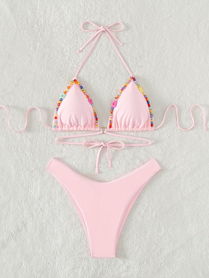 Beaded Binding Halter Triangle Summer Beach Bikini Set