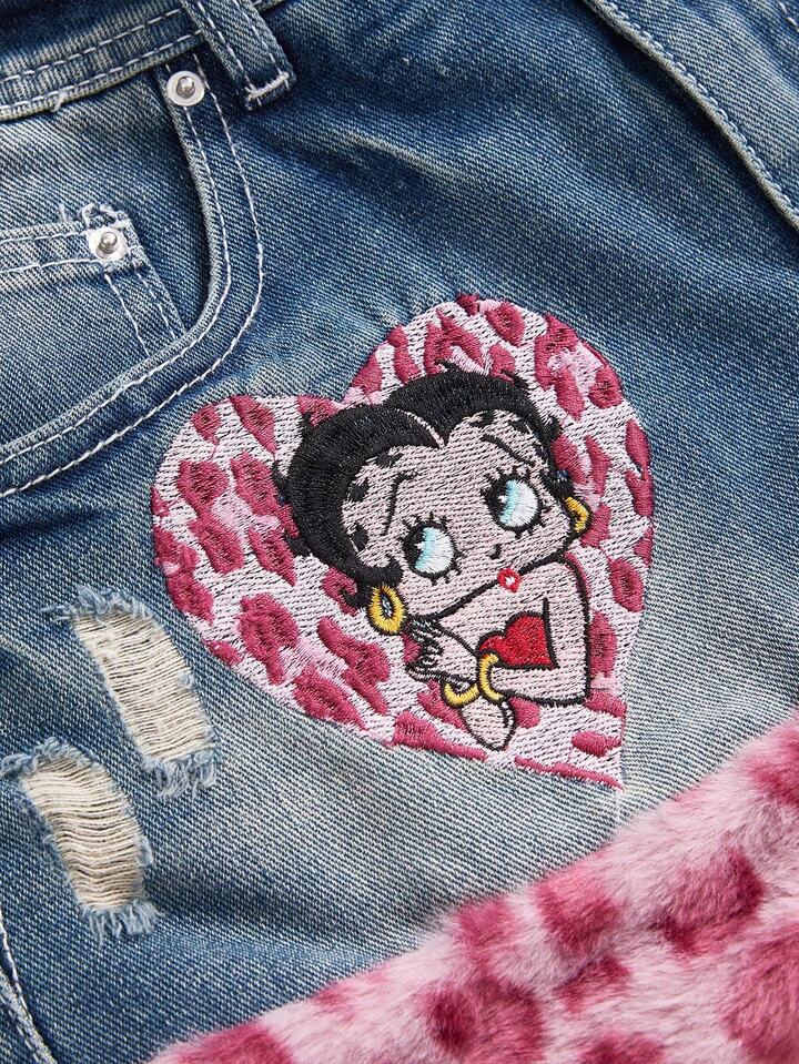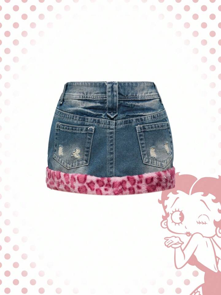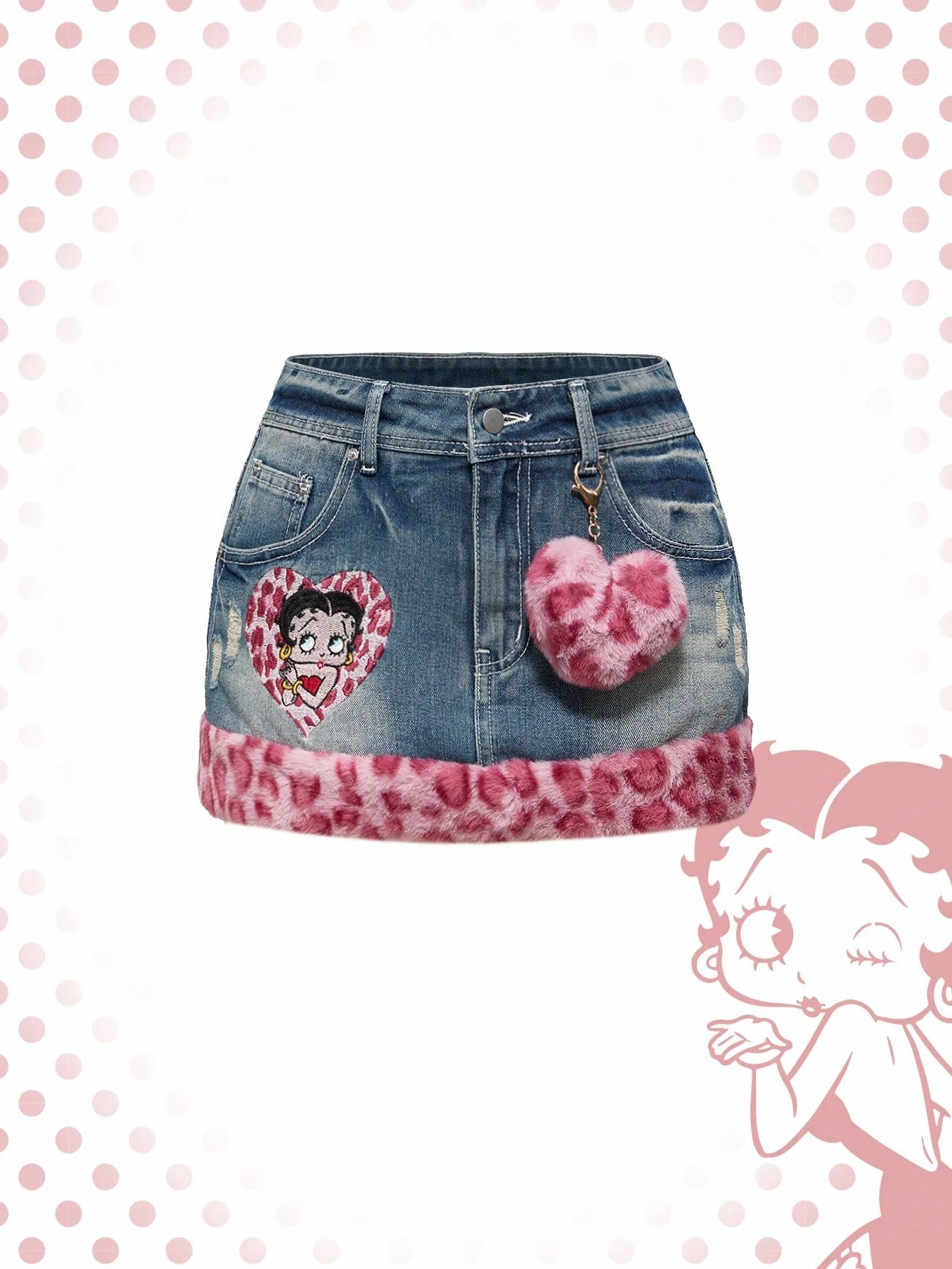 Betty Boop | ROMWE Y2K Baddie Cartoon Figure Graphic Embroidery Patchwork Leopard Print Frayed Super Low Waist Mini Denim Skirt