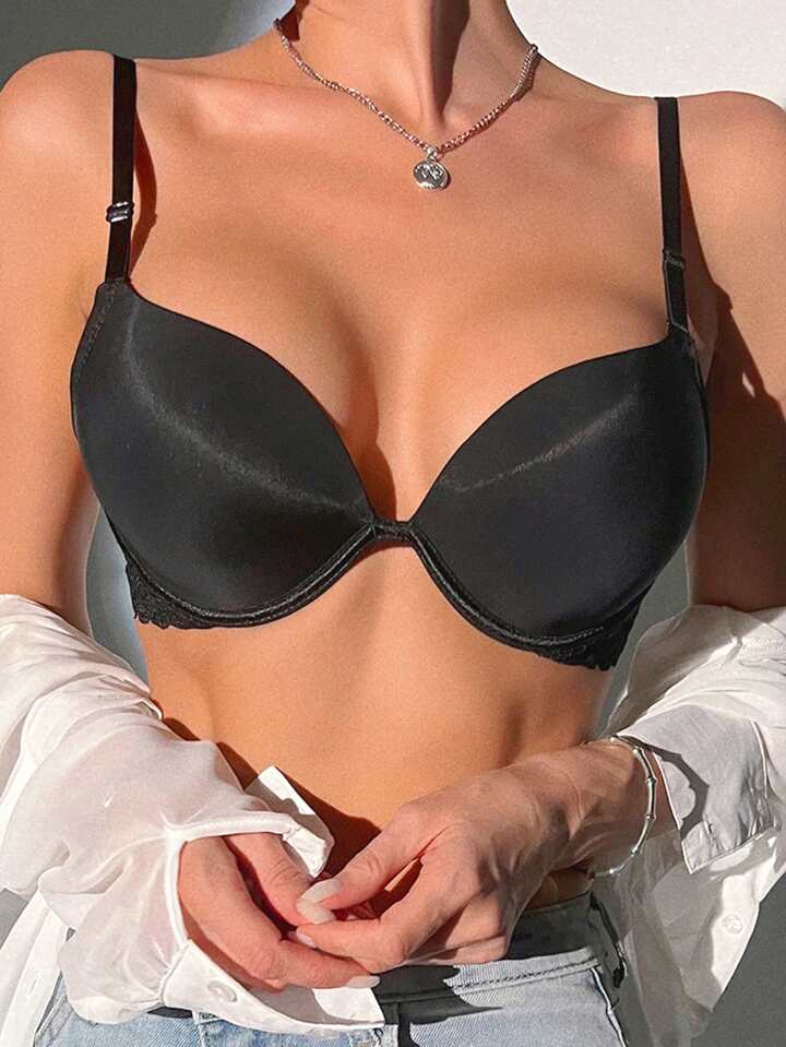 Black Contrast Lace Push Up Bra For Women With Slight Stretch Fabric