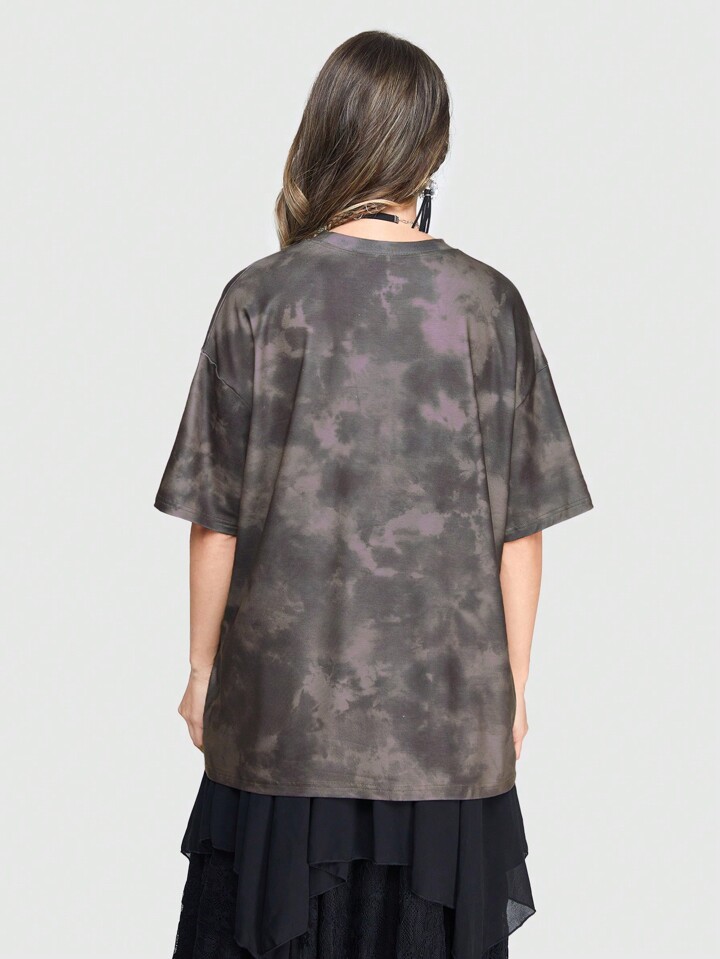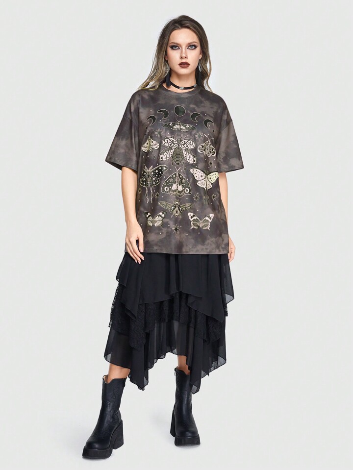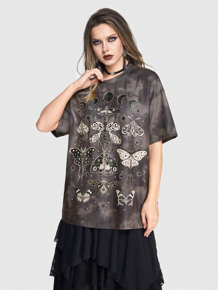Boho Dark Gothic Style Insect, Butterfly, Moon, Star Printed Casual Loose Tie-Dye T-Shirt