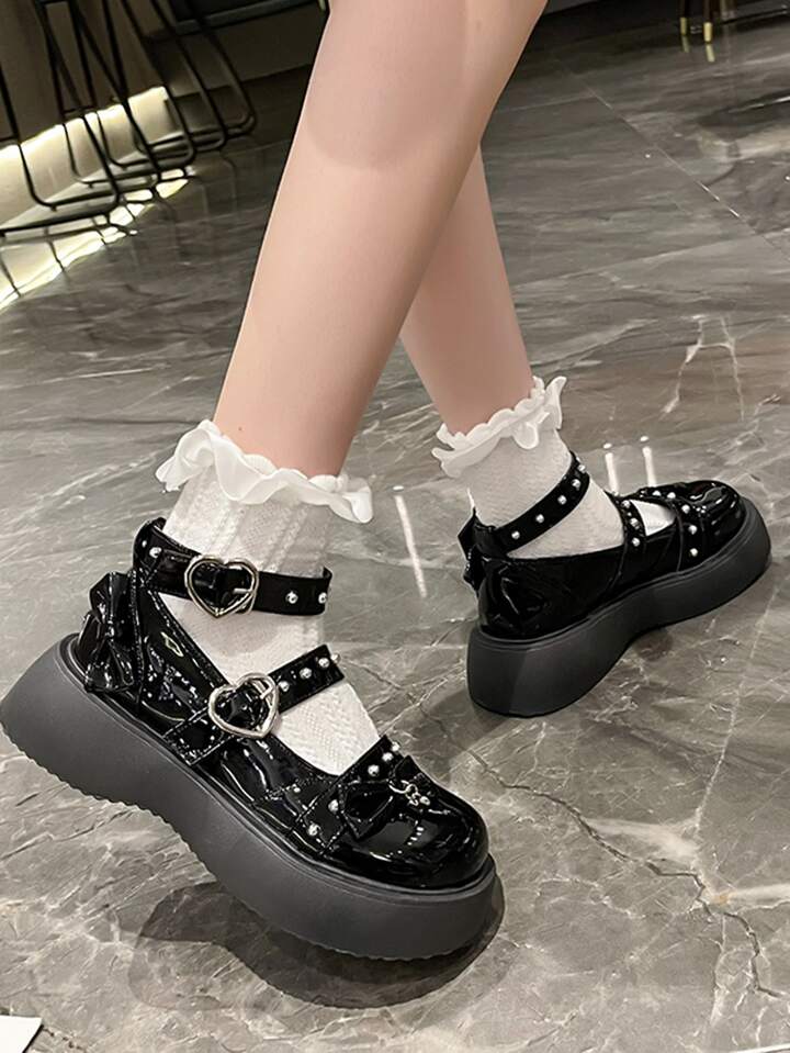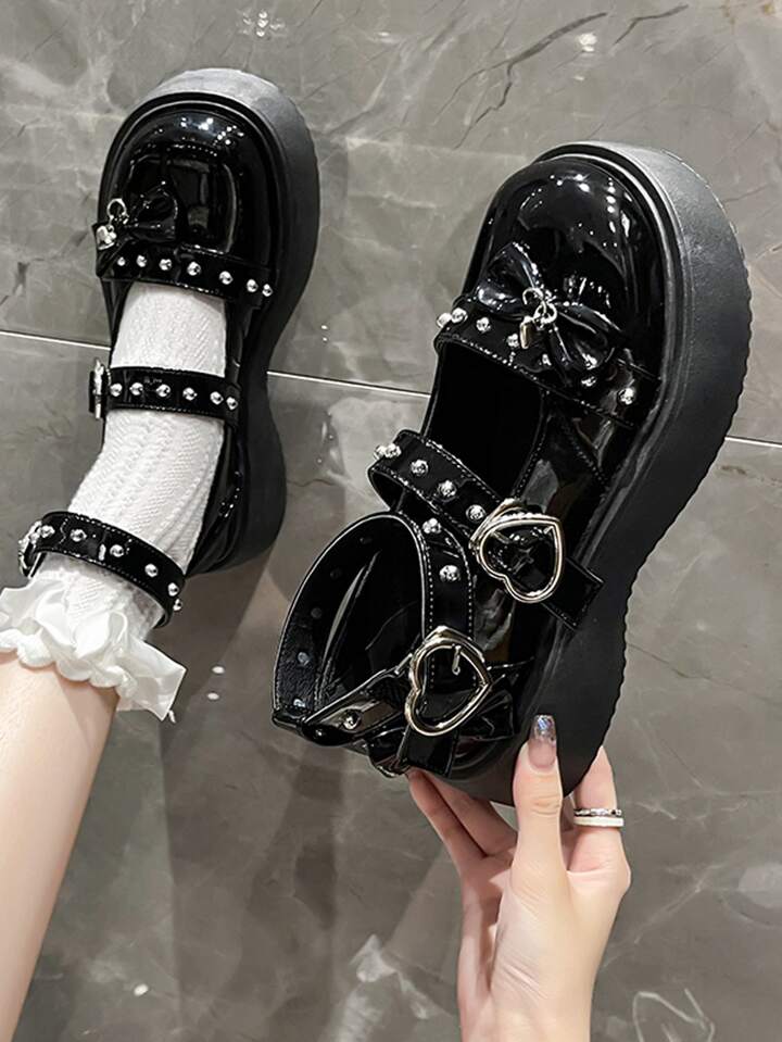 Bow & Studded Decor Flatform Mary Jane Shoes