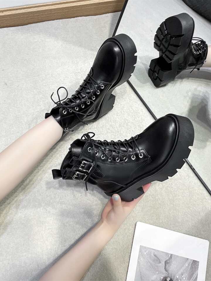 Buckle Decor Zipper Side Lace-up Front Platform Combat Boots