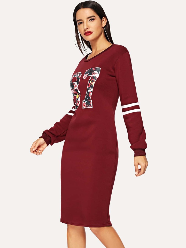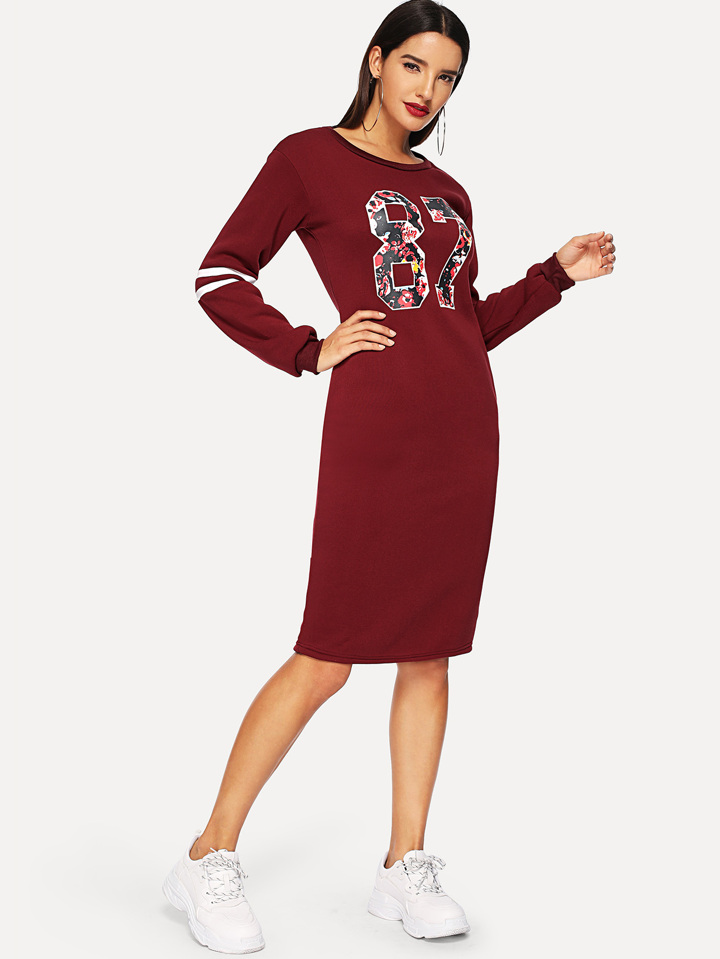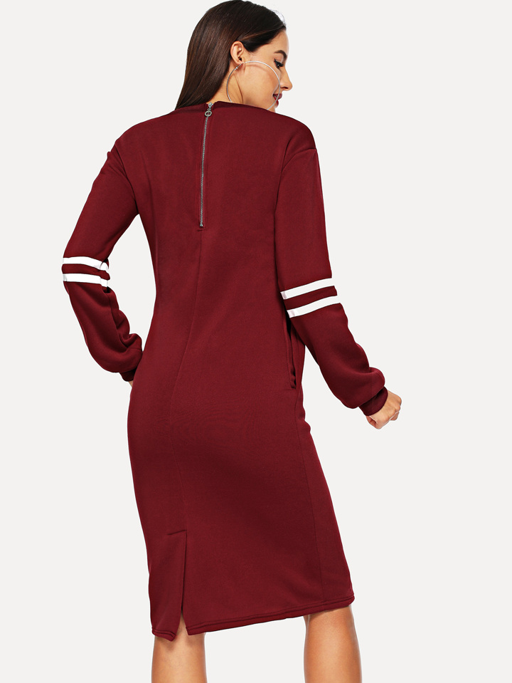 Burgundy Varsity Print Slit Back Zipper Sweatshirt Dress