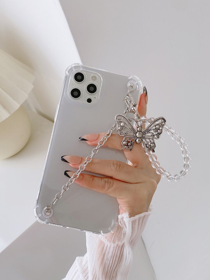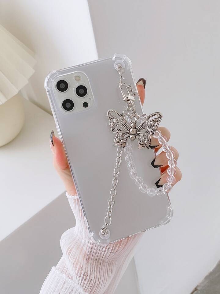 Butterfly Decor Beaded Hand Strap Phone Case
