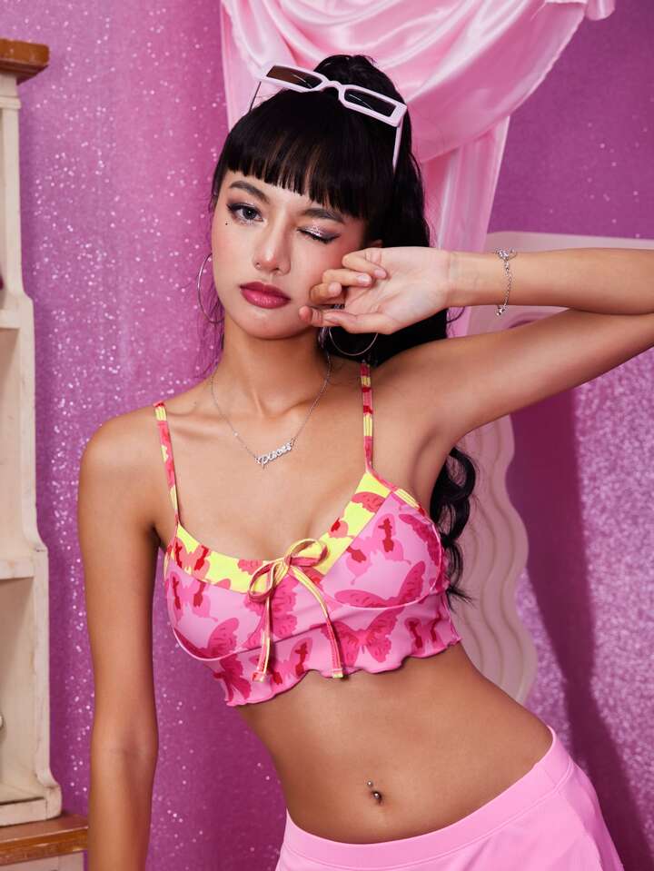 Butterfly Pattern Bow Front Lettuce Trim Bikini Top